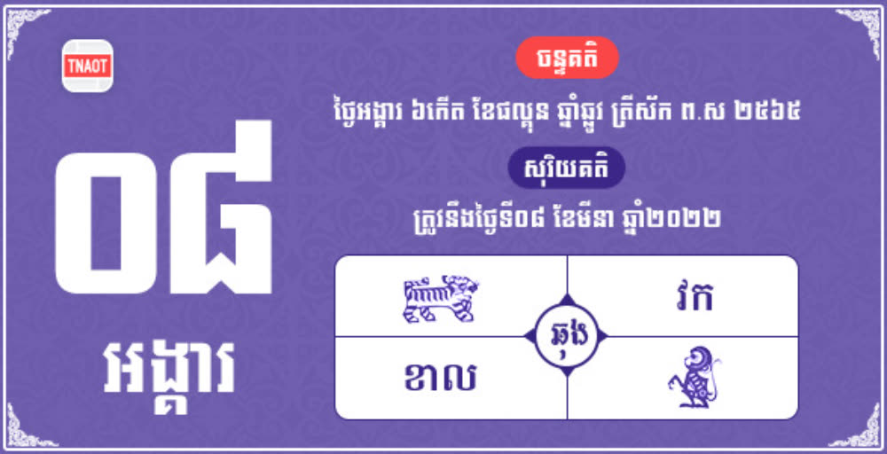 តាមក្បួនហោរាសាស្ត្រ ថ្ងៃអង្គារ ៦កើត ខែផល្គុន ឆ្នាំឆ្លូវ ត្រីស័ក ពុទ្ធសករាជ ២៥៦៥ ត្រូវនឹងថ្ងៃទី៨ ខែមីនា ឆ្នាំ២០២២ ឆ្នាំវក ឆុងជាមួយខាល។