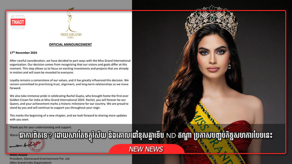 ភ្ញាក់ផ្អើលខ្លាំង! ND នៃស្ថាប័ន Miss Grand India ប្រកាសបញ្ចប់កិច្ចសហការជាមួយ MGI ហើយ