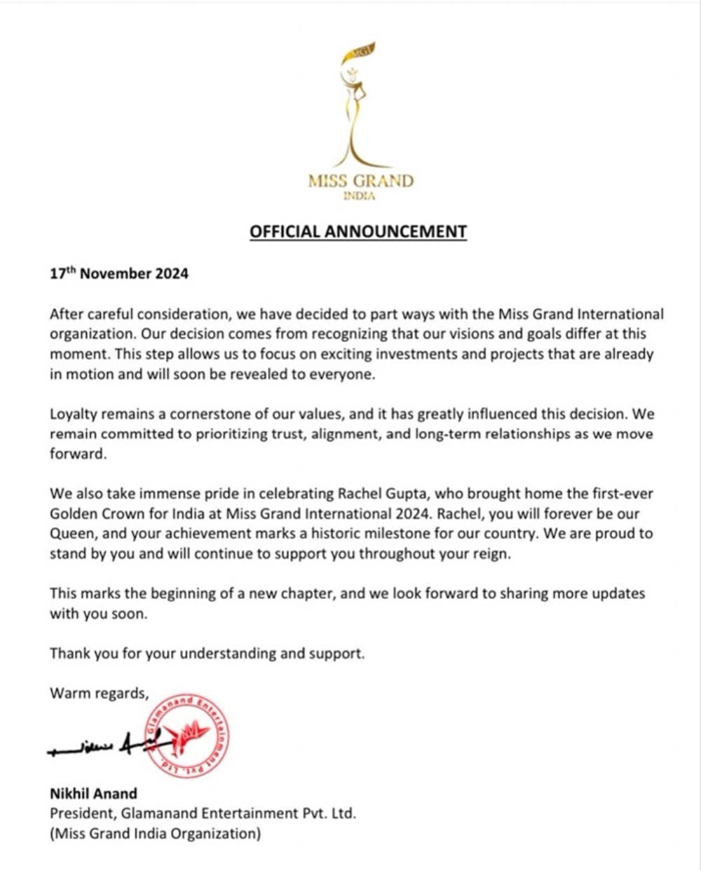 តាមរយៈគណនីបណ្តាញសង្គម Instagram របស់ស្ថាប័ន Miss Grand India បានចេញសេចក្តីថ្លែងការណ៍ផ្លូវការមួយកាលពីពេលថ្មីៗនេះ បានឲ្យដឹងថា «ក្រោយពិចារណាយ៉ាងយកចិត្តទុកដាក់ ពួកយើងបានសម្រេចចែកផ្លូវលែងសហការជាមួយស្ថាប័ន Miss Grand International (MGI)បន្ត ទៀតហើយ។ ការសម្រេចចិត្តបែបនេះកើតចេញដោយការទទួលស្គាល់ថា ចក្ខុវិស័យ និងគោលដៅរបស់យើងគឺមានភាពខុសគ្នាដោយមិនឈរនៅលើមាគ៌ាតែមួយ។ ជំហានមួយនេះបានអនុញ្ញាតឱ្យយើងផ្ដោតលើការវិនិយោគ និងគម្រោងដ៏រីករាយមួយដែលកំពុងតែដំណើរការ ដោយយើងនឹងទម្លាយប្រាប់ឲ្យគ្រប់គ្នាបានដឹងក្នុងពេលឆាប់ៗនេះ។ ភាពស្មោះត្រង់នៅតែជាមូលដ្ឋានគ្រឹះនៃគុណតម្លៃរបស់យើង ហើយវាក៏ជះឥទ្ធិពលយ៉ាងខ្លាំងក្លាលើការសម្រេចចិត្តមួយនេះផងដែរ។