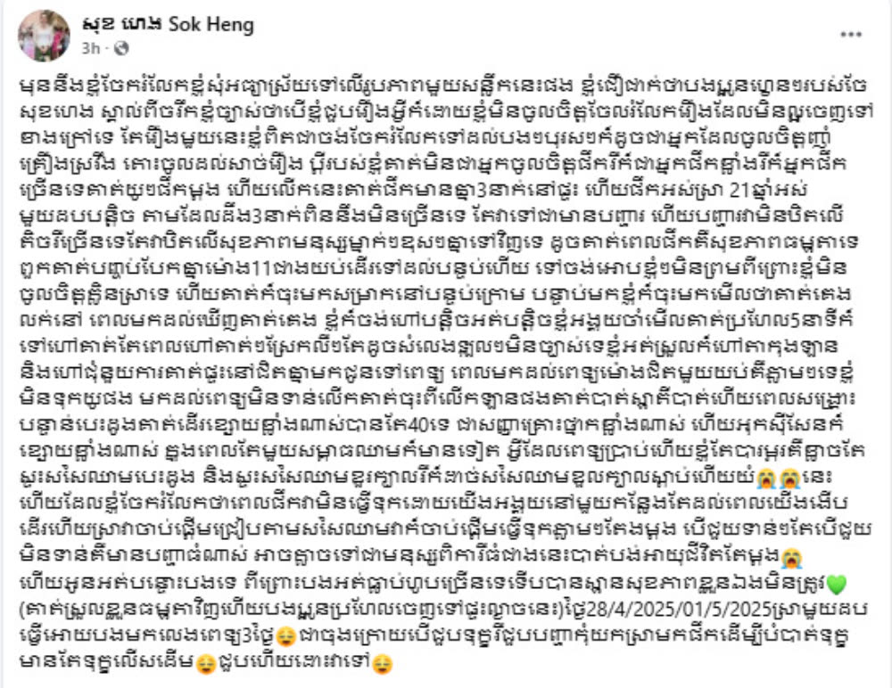 គ្រប់គ្នាច្បាស់ជាស្គាល់អ្នកជំនួញអនឡាញដ៏ល្បី មានទ្រព្យសម្បត្តិស្តុកស្តម្ភ អ្នកនាង សុខ ហេង រួចមកហើយ ដោយកម្រឃើញអ្នកនាងចែករំលែករឿងមិនល្អនៅលើបណ្តាញសង្គមហ្វេសប៊ុកឡើយ តែនៅពេលនេះអ្នកនាងកំពុងជួបទុក្ខ ខណៈស្វាមីត្រូវចូលសម្រាកព្យាបាលនៅមន្ទីពេទ្យភ្លាមៗ បន្ទាប់ពីពិសាស្រាមួយដបមានគ្នា ៣នាក់។