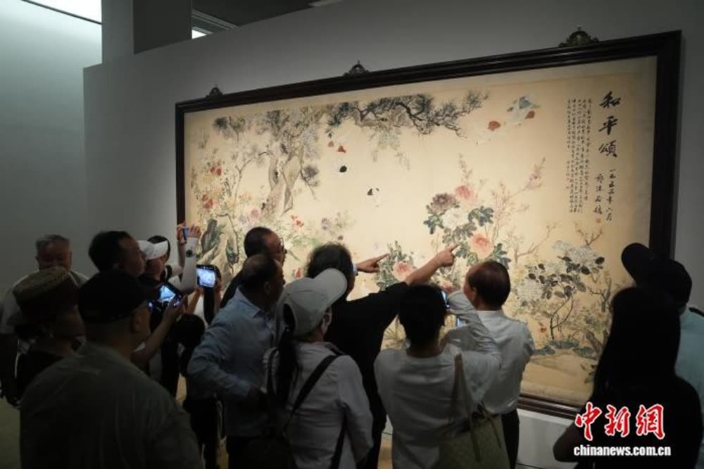 7月19日,“和平颂”美术作品展在中国美术馆开幕,图为观众欣赏创作于1955年的巨幅国画《和平颂》