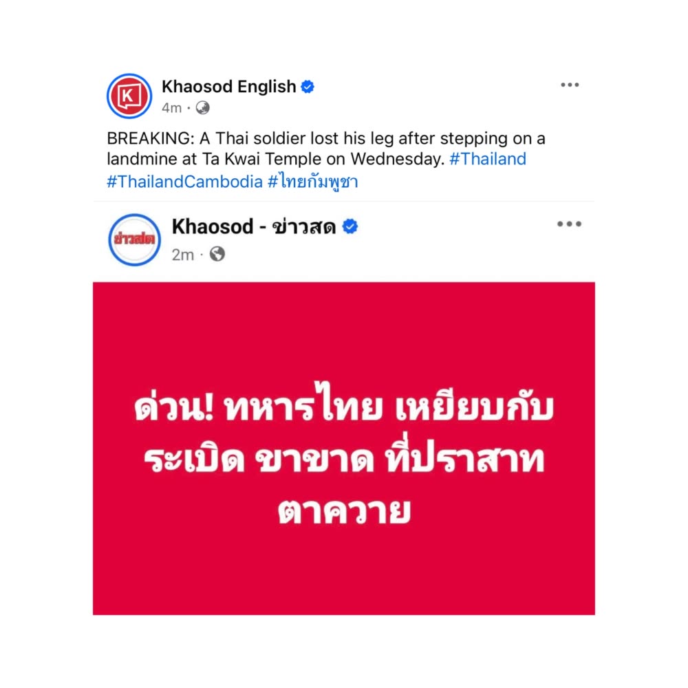 មួយករណីទៀតហើយ! ទាហានថៃម្នាក់ទៀត បានដើរជាន់មីន បណ្ដាលឱ្យដាច់ជើងម្ខាង នៅថ្ងៃទី២៧ ខែសីហា ឆ្នាំ២០២៥ នៅតំបន់ប្រាសាទតាក្របី។
