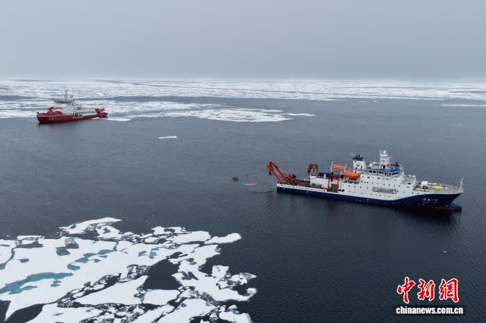 在“雪龙2”号船的保障支持下,“深海一号”船搭载“蛟龙”号在北极冰区作业。(自然资源部供图)