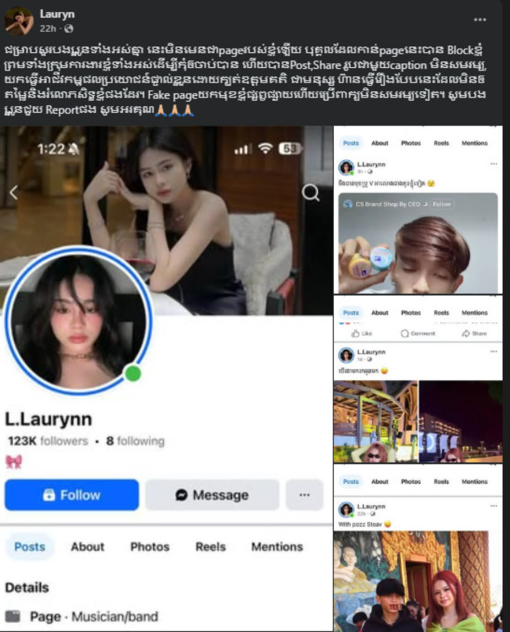 ដោយក្នុងនោះ កញ្ញា Lauryn បានប្រកាសក្នុងបណ្ដាញសង្គមដើម្បីកុំឲ្យមហាជនយល់ច្រឡំបែបនេះថា៖ «ជម្រាបសួរបងប្អូនទាំងអស់គ្នា នេះមិនមែនជាpageរបស់ខ្ញុំឡើយ បុគ្គលដែលកាន់pageនេះបាន Blockខ្ញុំព្រមទាំងក្រុមការងារខ្ញុំទាំងអស់ដើម្បីកុំឲចាប់បាន ហើយបានPost,Share រូបជាមួយcaption មិនសមរម្យ, យកធ្វើអាជីវកម្មផលប្រយោជន៍ផ្ទាល់ខ្លួនដោយក្បត់ឧត្តមគតិ ជាមនុស្ស ហ៊ានធ្វើរឿងបែបនេះដែលមិនឲតម្លៃនិងរំលោភសិទ្ធខ្ញុំផងដែរ។ Fake pageយកមុខខ្ញុំផ្សព្វផ្សាយហើយប្រើពាក្យមិនសមរម្យទៀត។ សូមបងប្អូនជួយ Reportផង»។