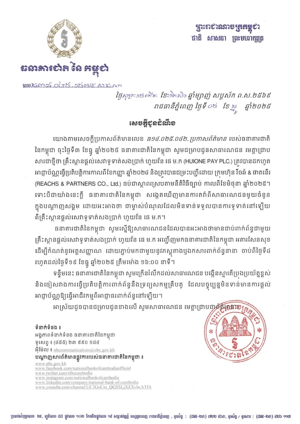 នៅល្ងាចថ្ងៃទី០៥ ខែធ្នូ នេះ ធនាគារជាតិនៃកម្ពុជា បានចេញសេចក្តីប្រកាសព័ត៌មានបញ្ជាក់សារជាថ្មីថា គ្រឹះស្ថានផ្តល់សេវាទូទាត់សងប្រាក់ ហួយវ័ន ផេ ម.ក (HUIONE PAY PLC.) ត្រូវបានដកហូត អាជ្ញាប័ណ្ណធ្វើប្រតិបត្តិការកាលពីខែកញ្ញា ឆ្នាំ២០២៤ និងត្រូវបានជម្រះបញ្ជីដោយ ក្រុមហ៊ុន រីចន៍ & ផាតនើរ (REACHS & PARTNERS CO., Ltd.) ចប់ជាស្ថាពរស្របតាមនីតិវិធីច្បាប់ កាលពីខែមិថុនា ឆ្នាំ២០២៥។