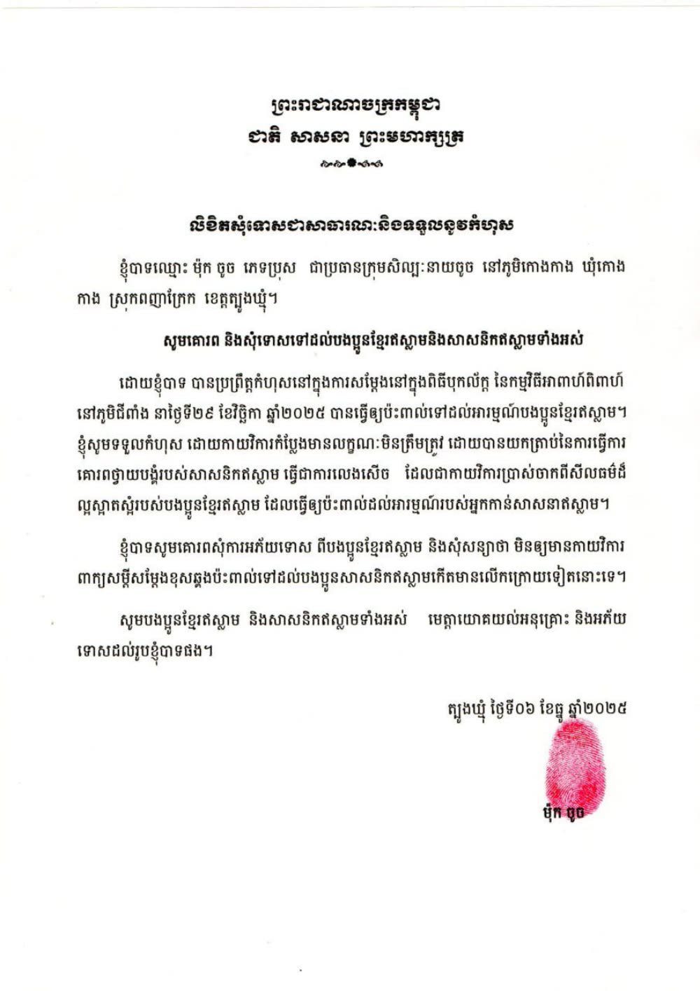 ទីបំផុតលោក ម៉ុក ចូច ចេញលិខិតសុំទោសជាសាធារណៈ និងកិច្ចសន្យា ក្រោយសម្តែងមិនសមរម្យប៉ះពាល់បងប្អូនឥស្លាម
