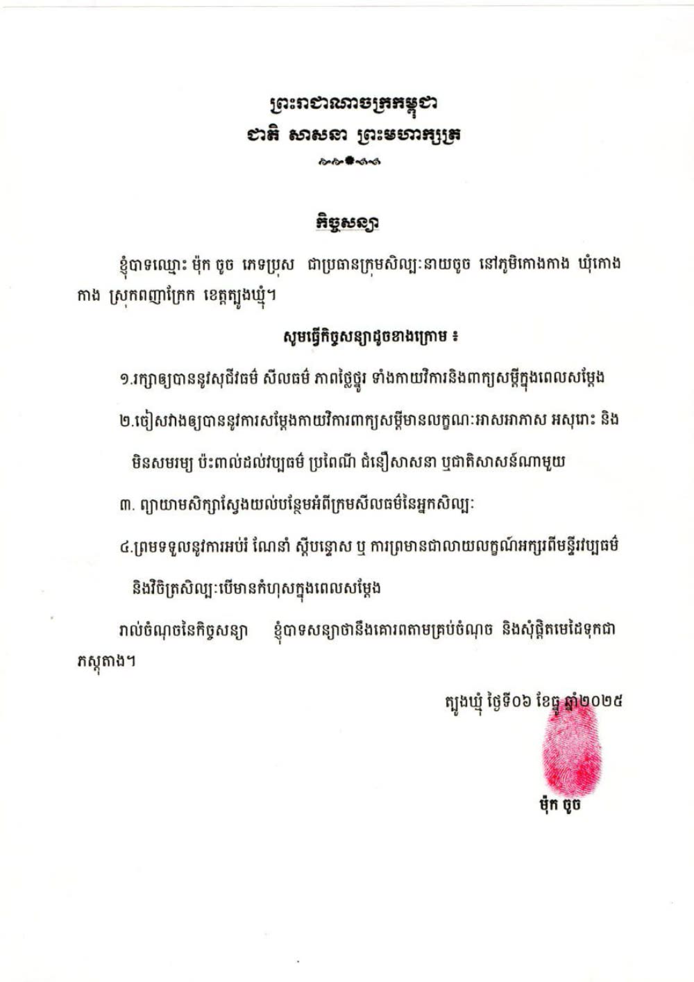 ៤. ព្រមទទួលនូវការអប់រំ ណែនាំ ស្តីបន្ទោស ឬ ការព្រមានជាលាយលក្ខណ៍អក្សរពីមន្ទីរវប្បធម៌ និងវិចិត្រសិល្បៈបើមានកំហុសក្នុងពេលសម្តែងរាល់ចំណុចនៃកិច្ចសន្យា ខ្ញុំបាទសន្យាថានឹងគោរពតាមគ្រប់ចំណុច និងសុំផ្តិតមេដៃទុកជាភស្តុតាង៕