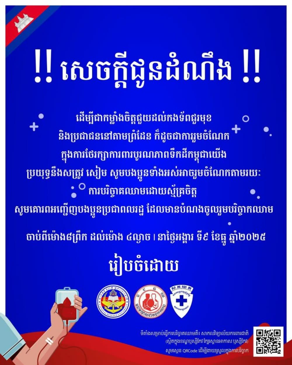 ស្របពេលដែរ សមាគមនគ្រូពេទ្យស្ម័គ្រចិត្តយុវជនសម្តេចតេជោ អំពាវនាវឱ្យពលរដ្ឋខ្មែរទៅចូលរួមបរិច្ចាគឈាម នៅសាកលវិទ្យាល័យការពារជាតិ ស្ថិតក្នុងខណ្ឌឫស្សីកែវក្បែរស្ពានអាកាសចាប់ពីម៉ោង៨ព្រឹក ដល់ម៉ោង៤ល្ងាច នៅទី៩ ខែធ្នូ ឆ្នាំ២០២៥។ ព្រឹត្តិការណ៍នេះ គឺដើម្បីជាកម្លាំងចិត្តជួយដល់កងទ័ពជួរមុខ និងប្រជាជននៅតាមព្រំដែន ក៏ដូចជាការរួមចំណែកក្នុងការថែរក្សាការពារបូរណភាពទឹកដីកម្ពុជា ប្រយុទ្ធនឹងការឈ្លានពានរបស់យោធាថៃ។