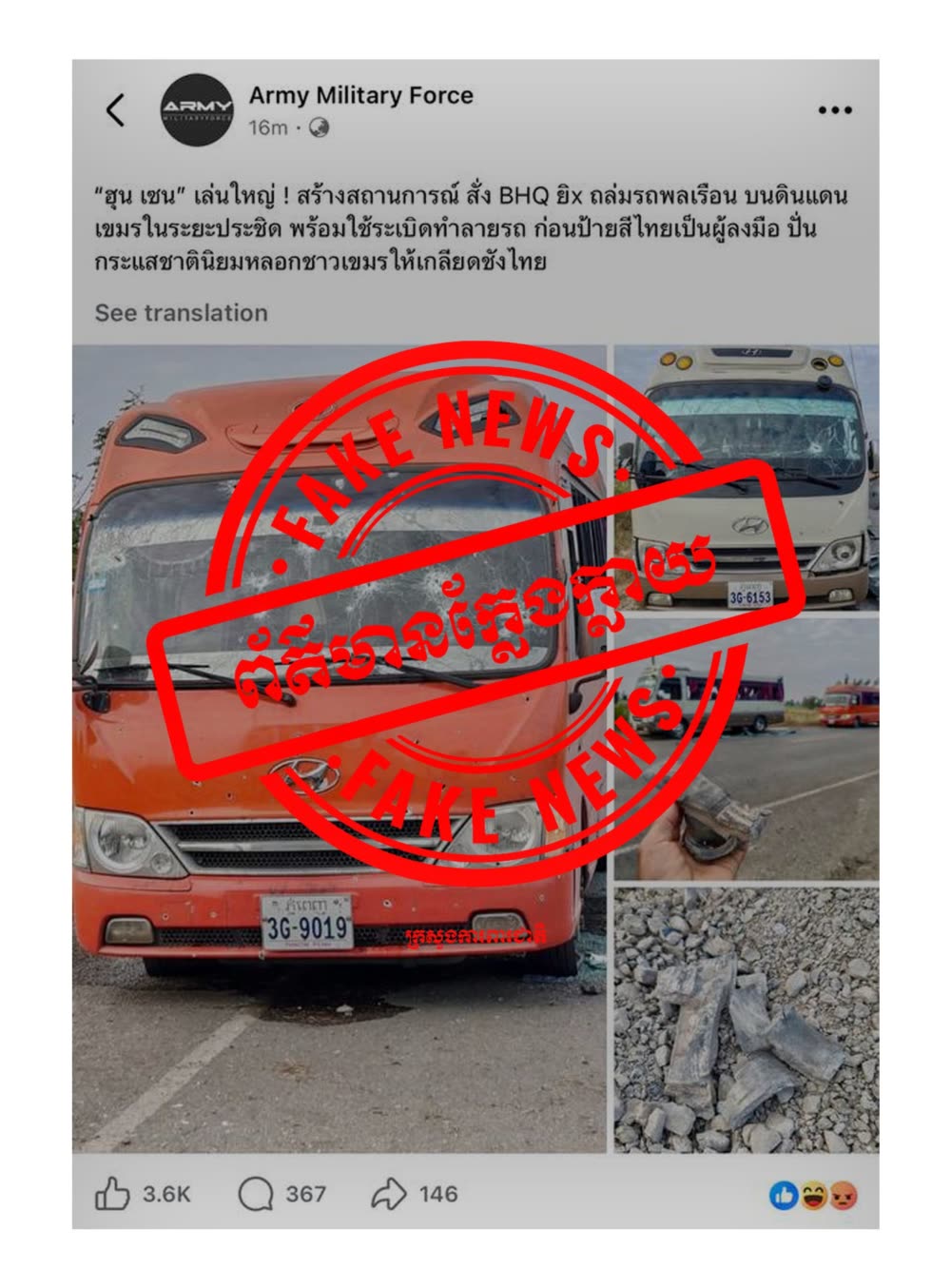 ការផ្សព្វផ្សាយនេះ ជាព័ត៌មានក្លែងក្លាយ ប្រាសចាកពីការពិតទាំងស្រុងដែលមានចេតនាមូលបង្កាច់ លាបពណ៌ប្រទេសកម្ពុជាដើម្បីបំភាន់មតិសារព័ត៌មានជាតិ និងអន្តរជាតិដើម្បីបិទបាំងចេតនាការឈ្លានពានរបស់ប្រទេសថៃ មកលើអធិបតេយ្យភាពស្របច្បាប់របស់កម្ពុជា។