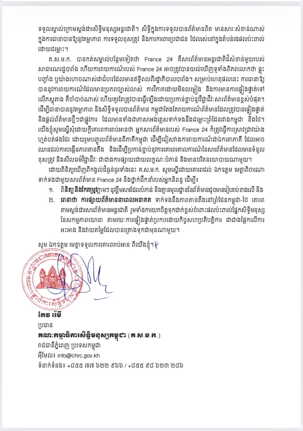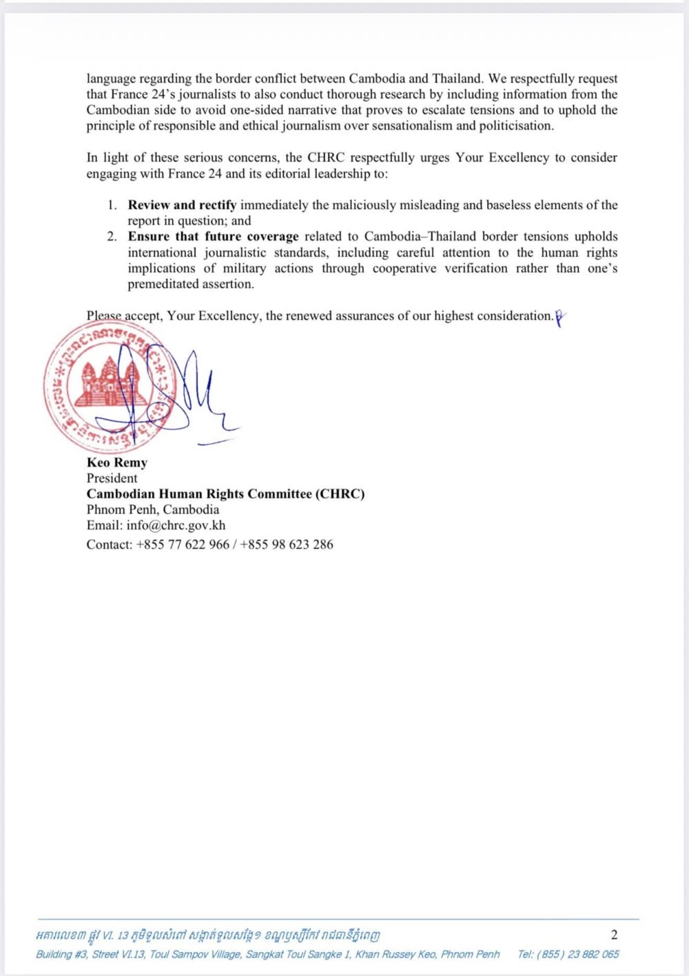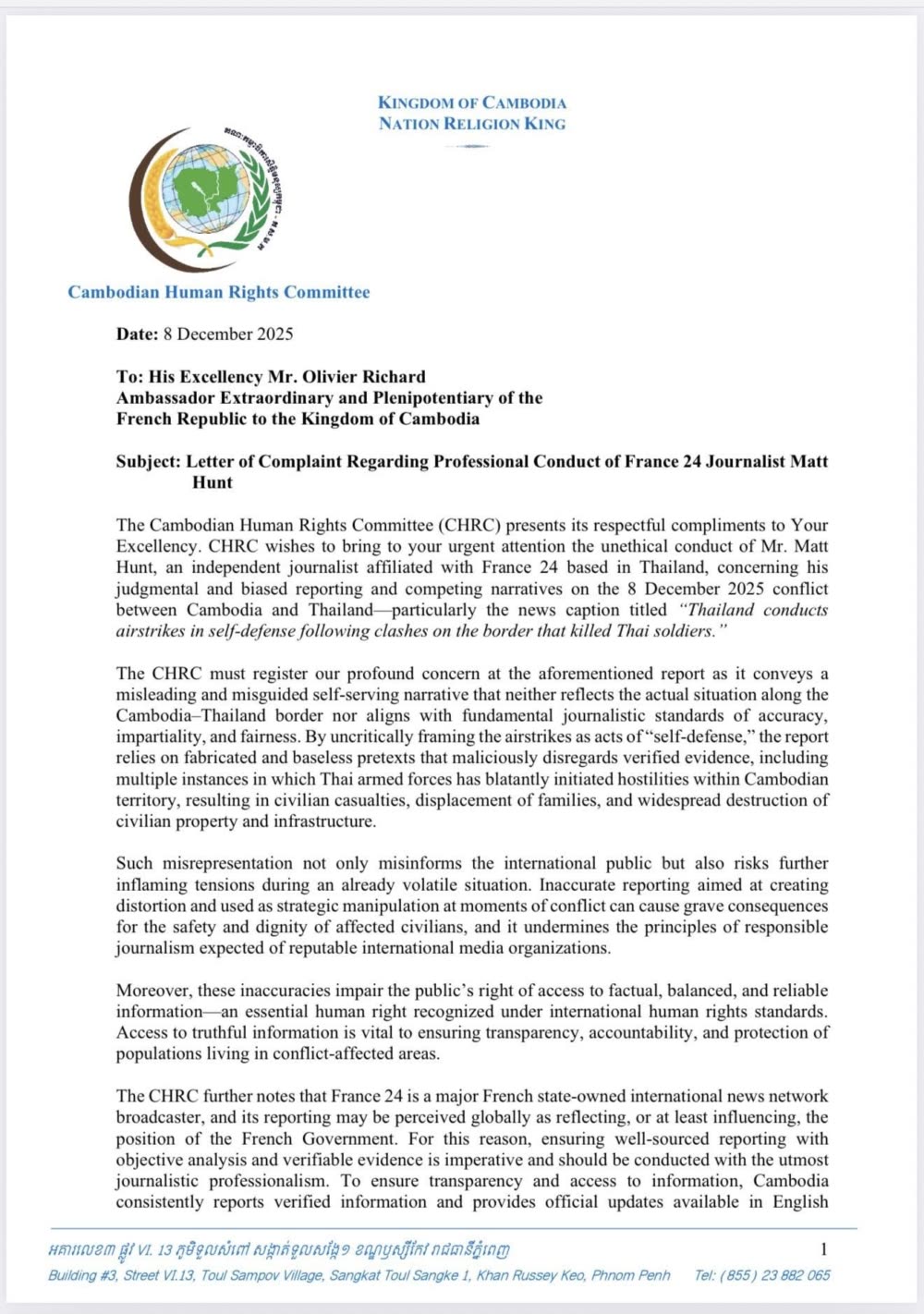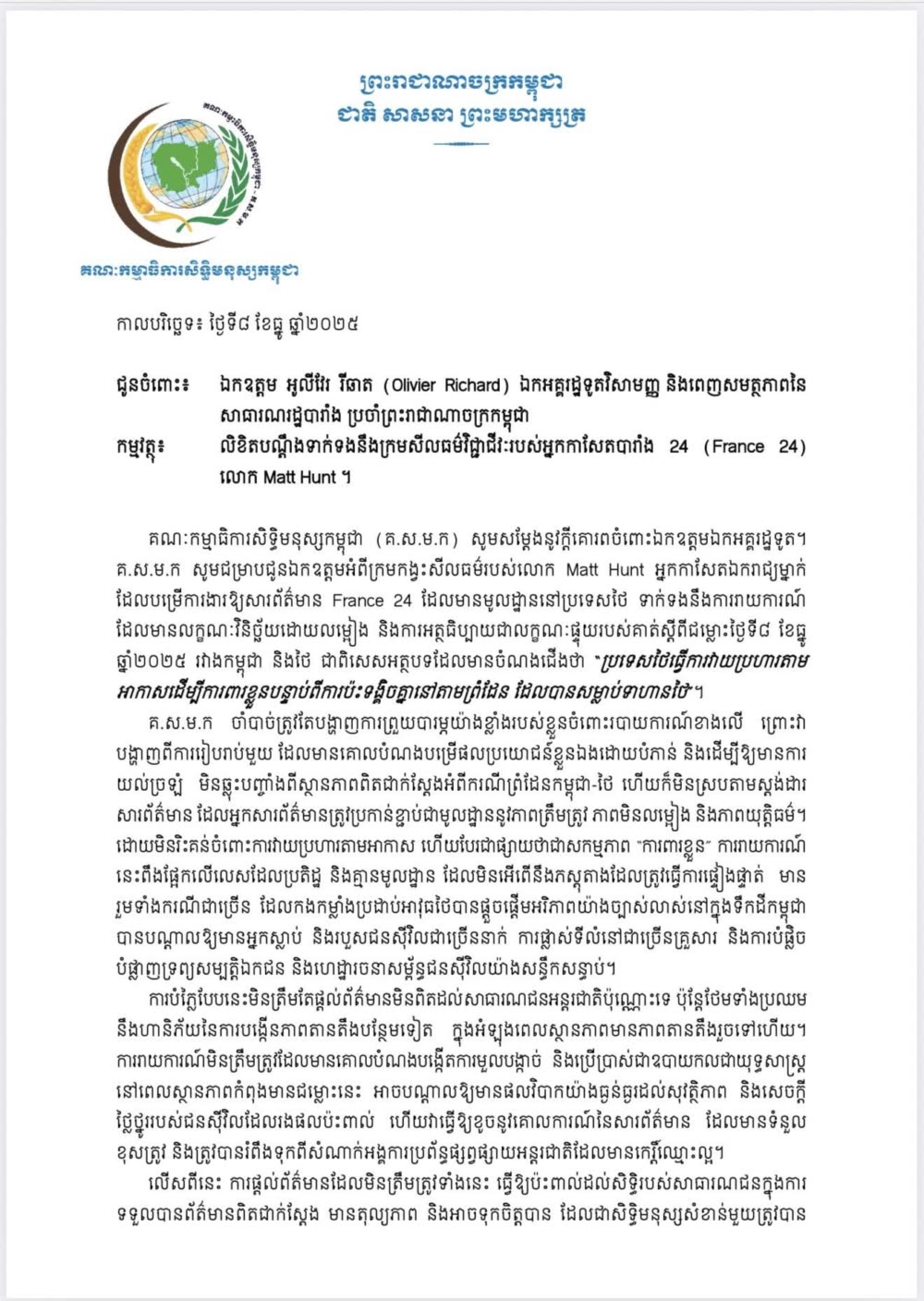 គ.ស.ម.ក ប្តឹងទៅស្ថានទូតបារាំង អ្នករាយការណ៍ព័ត៌មាន TV France 24 ម្នាក់ផ្សាយខុសពីការពិតពីជម្លោះព្រំដែនកម្ពុជា-ថៃ