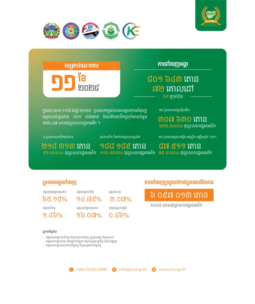 ការនាំចេញក្នុងរយៈពេល១១ខែ នៃឆ្នាំ២០២៥ កម្ពុជាបាននាំចេញអង្ករចំនួន ៨០១ ៦៤៣ តោន គិតជាទឹកប្រាក់បានចំនួន ៥២៦.៤៧ លានដុល្លារសហរដ្ឋអាមេរិក។ ការនាំចេញអង្ករបានធ្វើឡើង តាមរយៈក្រុមហ៊ុននាំចេញអង្ករចំនួន៦៥ក្រុមហ៊ុន ទៅកាន់គោលដៅចំនួន៧២ ដែលក្នុងនោះទៅកាន់បណ្តាប្រទេសនៅក្នុងតំបន់អឺរ៉ុបចំនួន ២៨ បានបរិមាណអង្ករចំនួន ៣០៧.៦៣០ តោន គិតជាទឹកប្រាក់ចំនួន ២៣៦.៥៤ លានដុល្លារសហរដ្ឋអាមេរិក ទៅកាន់ប្រទេសចិន និងតំបន់រដ្ឋបាលស្វយ័តចំនួន ១៨៨.១៨៩ តោន គិតជាទឹកប្រាក់ចំនួន ១១៦,៥៣ លានដុល្លារសហរដ្ឋអាមេរិក ទៅកាន់ប្រទេសក្នុងអាស៊ាន ចំនួន៨ ប្រទេសបានបរិមាណចំនួន ២១៨ ៣១៣ តោន គិតជាទឹកប្រាក់ចំនួន ៩៣.៥០លានដុល្លារសហរដ្ឋអាមេរិក និងទៅកាន់គោលដៅ ៣៤ប្រទេសផ្សេងទៀតមាន បានចំនួន ៨៧, ៥១១តោន គិតជាទឹកប្រាក់ចំនួន៧៩.៩០លានដុល្លារសហរដ្ឋអាមេរិក៕