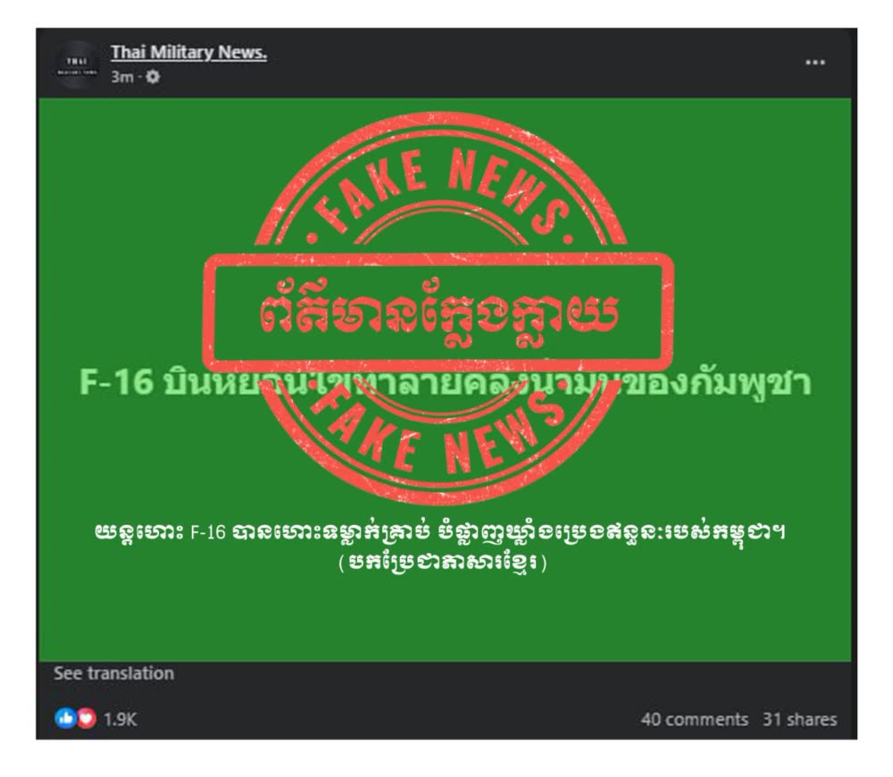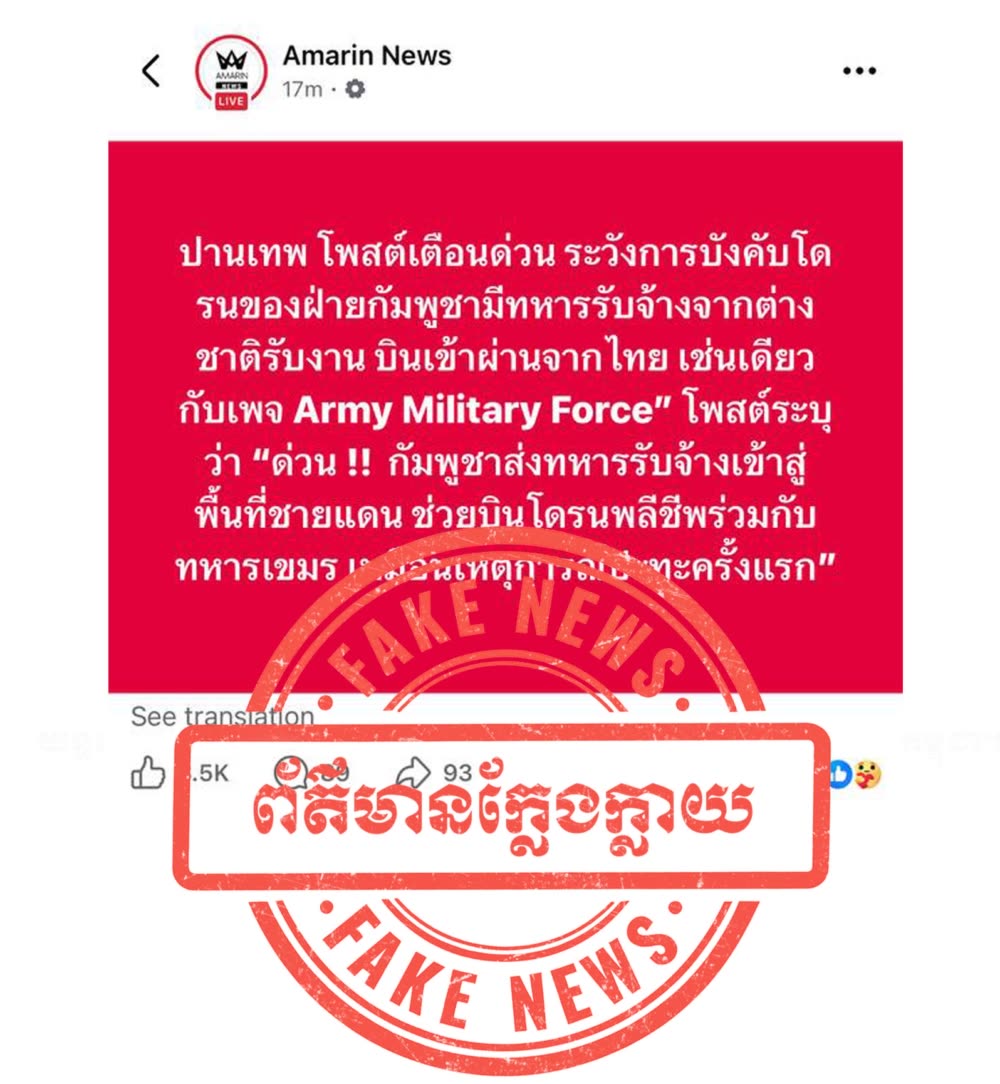 ក្រសួងការពារជាតិកម្ពុជា បញ្ចាក់ថា ការផ្សព្វផ្សាយរបស់សារព័ត៌មាន Thai Tribune និងផេកហ្វេសប៊ុក Army Military Force ដែលបានចោទប្រកាន់ថាកម្ពុជា ប្រើប្រាស់ទាហានស៊ីឈ្នួលបរទេសមកជួយបង្ហោះដ្រូនអត្តឃាតក្នុងជម្លោះព្រំដែនកម្ពុជា-ថៃ។