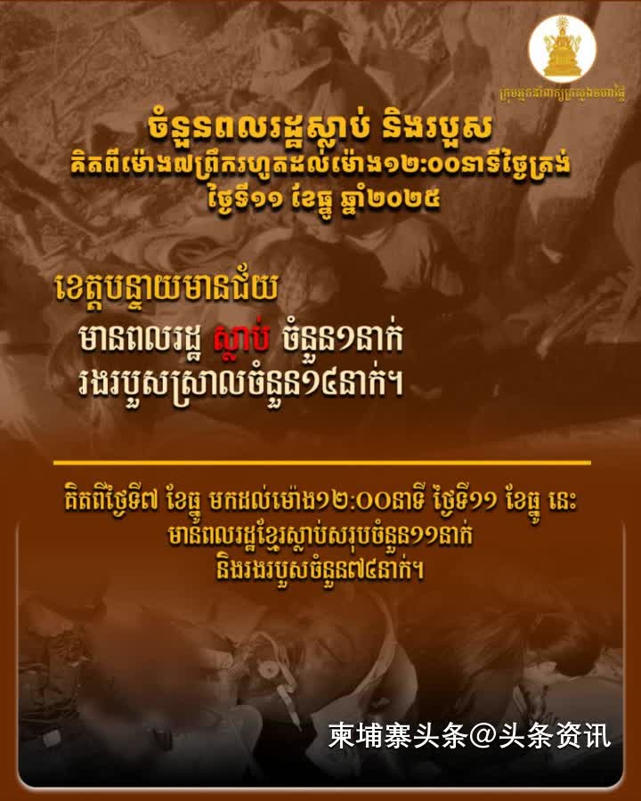 【柬埔寨头条综合报道】据柬埔寨内政部通报,2025年12月11日上午7时至中午12时,卜迭棉芷省新增1名平民死亡、14人轻伤。