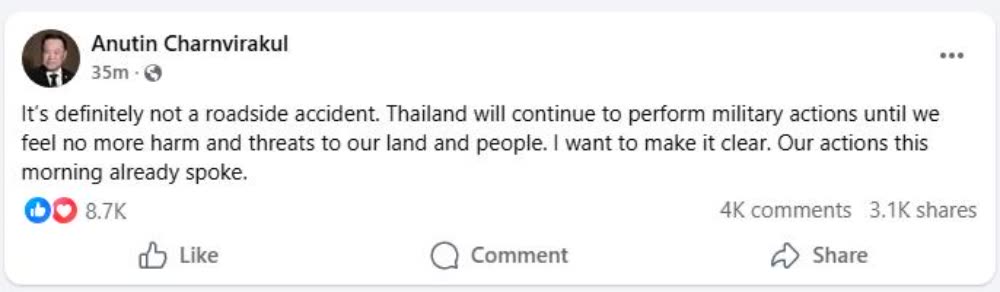 នាយករដ្ឋមន្ត្រីថៃ បានបង្ហោះសារលើគេហទំព័រហ្វ៊េសបុកផ្លូវការរបស់ខ្លួន តបទៅសំណេររបស់ប្រធានាធិបតីអាម៉េរិក វិញថាការជាន់មីនរបស់ទាហានថៃ មិនមែនជារឿងឧបទ្ទវហេតុទេ ហើយថាទាហានថៃ ដើរជាន់មីនកន្លងទៅគឺជារឿងឧបទ្ទវហេតុផ្សេងគ្នា។ នាយករដ្ឋមន្ត្រីថៃ បញ្ជាក់យ៉ាងច្បាស់ថាប្រទេសថៃ នឹងបន្តធ្វើសកម្មភាពយោធារហូតដល់ថៃលែងមានអារម្មណ៍ថាមានគ្រោះថ្នាក់ និងការគំរាមកំហែងដល់ទឹកដី និងប្រជាជនរបស់ថៃតទៅទៀត៕