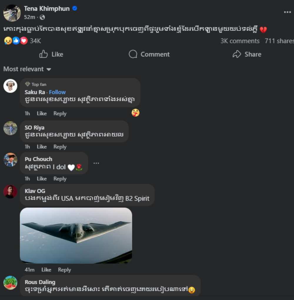 ក្រោយពីបានឃើញនៅសំណេរបែនេះហើយ មហាជនជាច្រើនមានបង្ហាញការព្រួយបារម្ភនិងស្រណោះ ព្រមទាំងខឹងសម្បារយ៉ាងខ្លាំងចំពោះយោធាថៃ ដែលបើកការបាញ់ប្រហារមកលើកម្ពុជា ធ្វើឲ្យប្រជាពលរដ្ឋខ្មែរស្លូតត្រង់មានការភ័យខ្លាច ព្រោះកន្លងមកធ្លាប់តែជាប្រទេសមួយដែលពោលពេញទៅដោយសុខសន្តិភាព តែបែជាចលាចរដោយសារតែការឈ្លានពានថៃមិនឲ្យយើងបានសុខ បន្ថែមពីនេះក៏មានបណ្ដាអ្នកគាំទ្រផ្សេងៗទៀតបញ្ចេញមតិដោយក្ដីបារម្ភជូនពរឲ្យ លោក ថេណា ព្រមទាំងប្រជាពលរដ្ឋខ្មែរទាំងអស់ទទួលបានសុខសុវត្ថិភាពផងដែរ៕ អត្ថបទដោយ៖ Sun Darasy