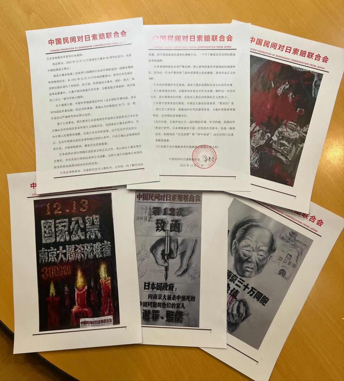 12月13日电 (田野青)南京大屠杀88周年之际,中国民间对日索赔联合会通过日本驻华大使馆,致信日本政府及首相高市早苗,要求就南京大屠杀的罪行向中国人民谢罪并赔偿。