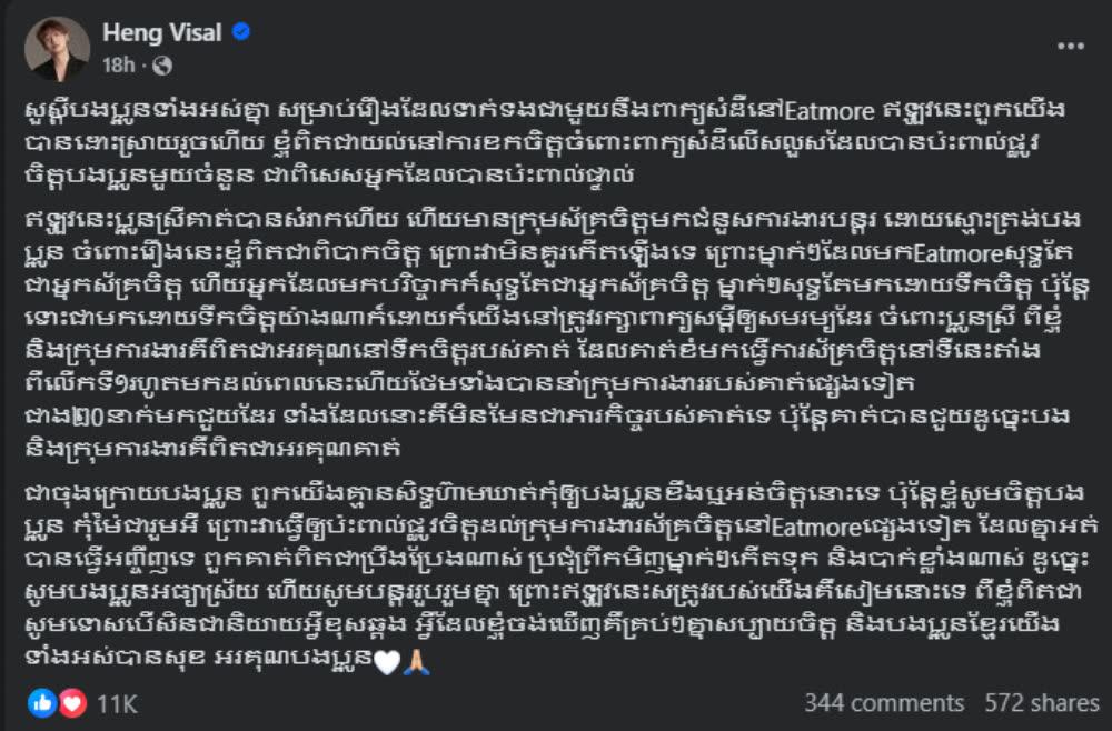 លោក ហេង វិសាល សុំការអធ្យាស្រ័យចំពោះបញ្ហាកើតឡើង ទាក់ទងជាមួយនឹងពាក្យសំដីនៅ Eatmore