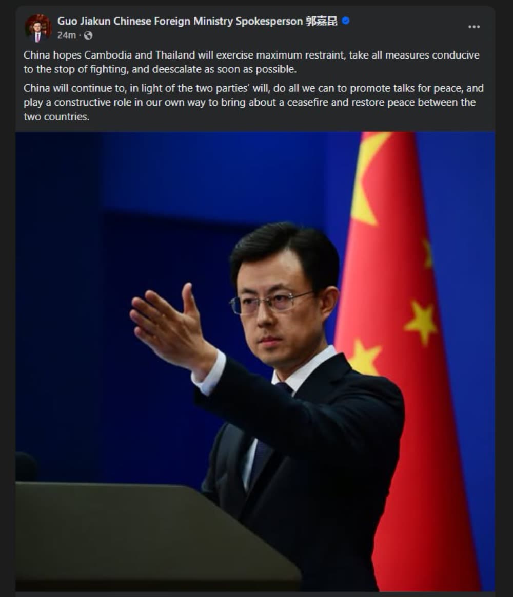 អ្នកនាំពាក្យក្រសួងការបទេសចិនលោក Guo Jiakun នៅថ្ងៃច័ន្ទ ទី១៥ ខែធ្នូ ឆ្នាំ ២០២៥ បាននិយាយនៅក្នុងសន្និសីទសារព័ត៌មានមួយថា ប្រទេសចិនសង្ឃឹមថា ប្រទេសកម្ពុជា និងប្រទេសថៃ នឹងអនុវត្តការអត់ធ្មត់អតិបរមា ចាត់វិធានការទាំងអស់ដែលអំណោយផលដល់ការបញ្ឈប់ការប្រយុទ្ធគ្នា និងបន្ធូរបន្ថយភាពតានតឹងឱ្យបានឆាប់បំផុត។