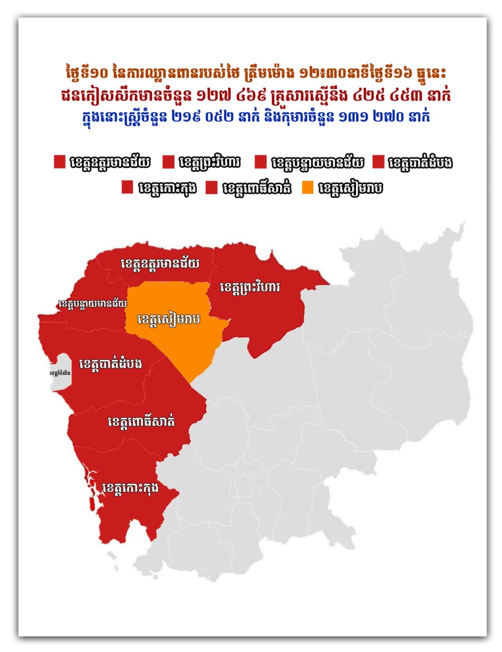 ថ្ងៃទី១០ នៃការឈ្លានពានរបស់ថៃ ត្រឹមម៉ោង ១២៖៣០នាទីថ្ងៃទី១៦ ធ្នូនេះ ជនភៀសសឹកមានចំនួន ១២៧ ៤៦៩ គ្រួសារស្មើនឹង ៤២៥ ៤៥៣ នាក់ ក្នុងនោះស្ត្រីចំនួន ២១៩ ០៥២ នាក់ និងកុមារចំនួន ១៣១ ២៧០ នាក់