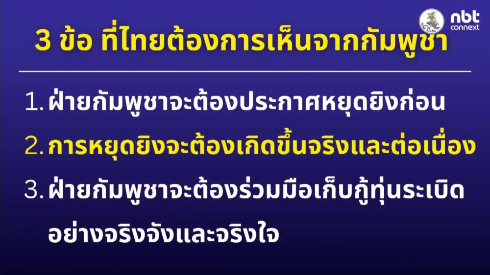 អ្នកនាំពាក្យក្រសួងការបរទេសថៃ លោក Nikorndej Balankura បានបញ្ជាក់ក្នុងសន្និសីទសារព័ត៌មាននៅថ្ងៃទី ១៥ ខែធ្នូម្សិលមិញនេះថា រាជរដ្ឋាភិបាលថៃបានដាក់ចេញនូវលក្ខខណ្ឌសំខាន់ៗចំនួន០៣ សម្រាប់កម្ពុជាដើម្បីធ្វើបទឈប់បាញ់ ចំពេលមានភាពតានតឹងតាមព្រំដែនដែលកំពុងបន្ត។