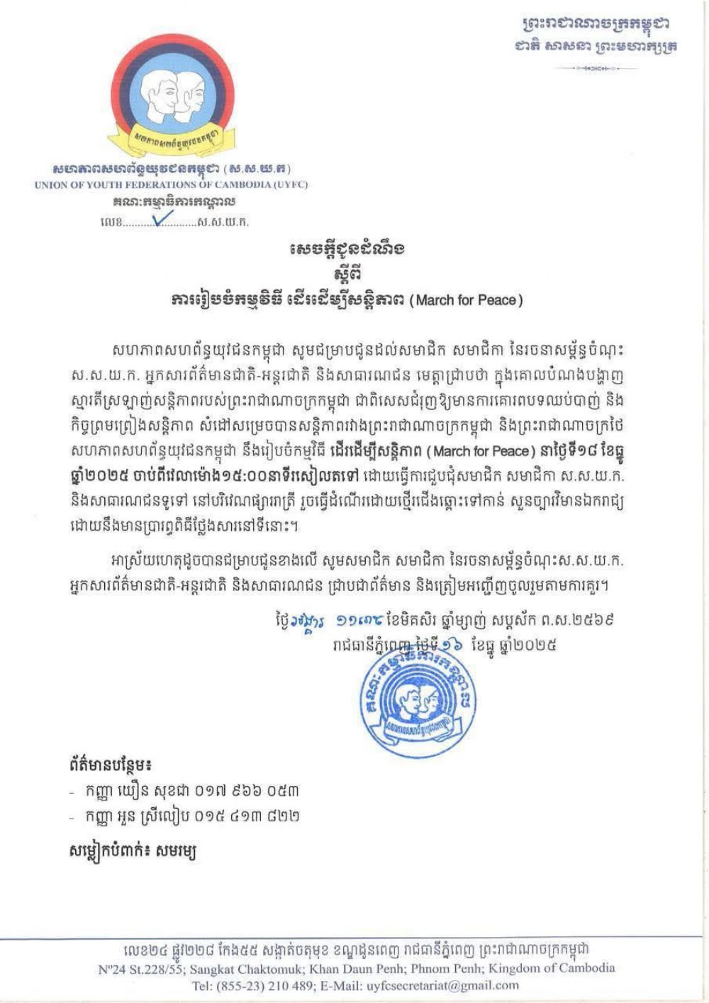 នាថ្ងៃទី១៨ ខែធ្នូ ឆ្នាំ២០២៥ សហភាពសហព័ន្ធយុវជនកម្ពុជា នឹងរៀបចំកម្មវិធី ដើរដើម្បីសន្ដិភាព (March for Peace) ក្នុងគោលបំណងដើម្បីបង្ហាញស្មារតីស្រឡាញសន្ដិភាពរបស់ព្រះរាជាណាចក្រកម្ពុជា ជាពិសេសជំរុញឱ្យមានការគោរពបទឈប់បាញ់ និងកិច្ចព្រមព្រៀងសន្ដិភាព រវាងព្រះរាជាណាចក្រកម្ពុជា និងព្រះរាជាណាចក្រថៃ។ កម្មវិធីនេះនឹងប្រព្រឹត្តទៅនៅម៉ោង ១៥និង០០រសៀល ថ្ងៃទី១៨ ខែធ្នូ ឆ្នាំ២០២៥៕