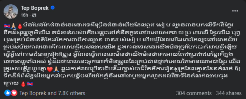 តារាចម្រៀង អ្នកនាង ទេព បូព្រឹក្ស បានបង្ហោះសំណេររៀបរាប់ពីជាតិសាសន៍ថៃដែលតែងតែឈ្លានពានមកលើទឹកដីខ្មែរតជំនាន់ និងដាស់ស្មារតីឲ្យប្រជាជនខ្មែរទាំងអស់ត្រូវរួបរួមសាមគ្គីគ្នាជាកម្លាំងតែមួយដើម្បីជួយដ៏វិរៈកងទ័ព និងពលរដ្ឋភៀសសឹក ឆ្លងផុតក្នុងកាលៈទេសៈដ៏លំបាកនេះ។