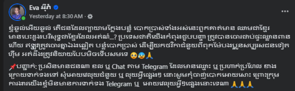 តារាចម្រៀង កញ្ញា អុីវ៉ា បានបង្ហោះសំណេរទាំងហួសចិត្ត ខណៈកញ្ញាត្រូវជនខិលខូចក្លែងបន្លំគណនី Telegram ប្រើប្រាស់រូបភាពភាព ក៏ដូចជាឈ្មោះ ក្នុងចេតនាមិនល្អដើម្បីបន្លំបោកប្រាស់យកថវិកាជំនួយពីសប្បុរសជន ស្របពេលដែលគ្រប់គ្នាកំពុងមមាញឹកក្នុងការជួយដ៏ពលរដ្ឋភៀសសឹក និងកងទ័ពជួរមុខ តែបែបជាមានមនុស្សឆ្លៀតឱកាសដើម្បីតែផលប្រយោជន៍ផ្ទាល់ខ្លួនមិនខ្វល់ពីបញ្ហាប្រទេសជាតិ។