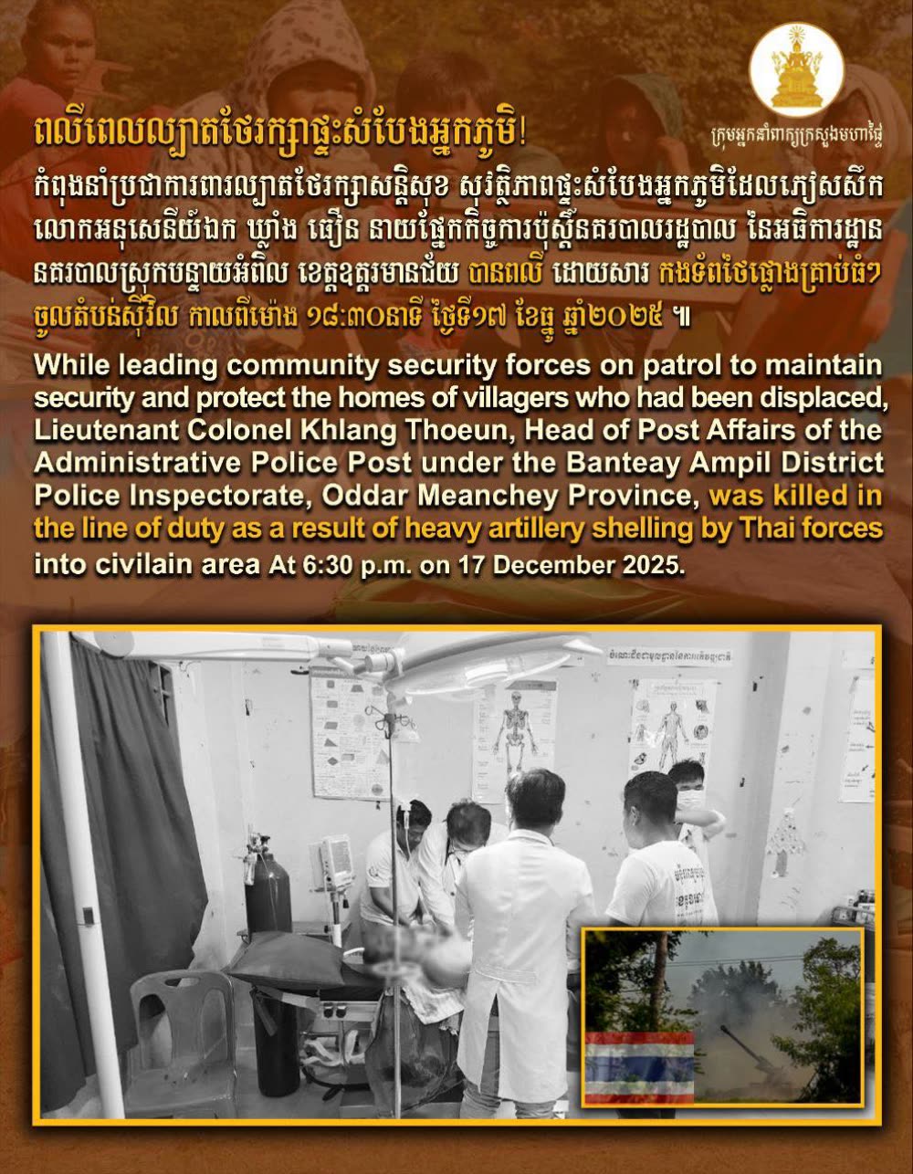 កំពុងនាំប្រជាការពារល្បាតថែរក្សាសន្តិសុខ សុវត្ថិភាពផ្ទះសំបែងអ្នកភូមិដែលភៀសសឹក លោកអនុសេនីយ៍ឯក ឃ្លាំង ធឿន នាយផ្នែកកិច្ចការប៉ុស្តិ៍នគរបាលរដ្ឋបាល នៃអធិការដ្ឋាននគរបាលស្រុកបន្ទាយអំពិល ខេត្តឧត្តរមានជ័យ បានពលី ដោយសារកងទ័ពថៃផ្លោងគ្រាប់ធំៗចូលតំបន់សុីវិល កាលពីម៉ោង ១៨:៣០នាទី ថ្ងៃទី១៧ ខែធ្នូ ឆ្នាំ២០២៥នេះ៕