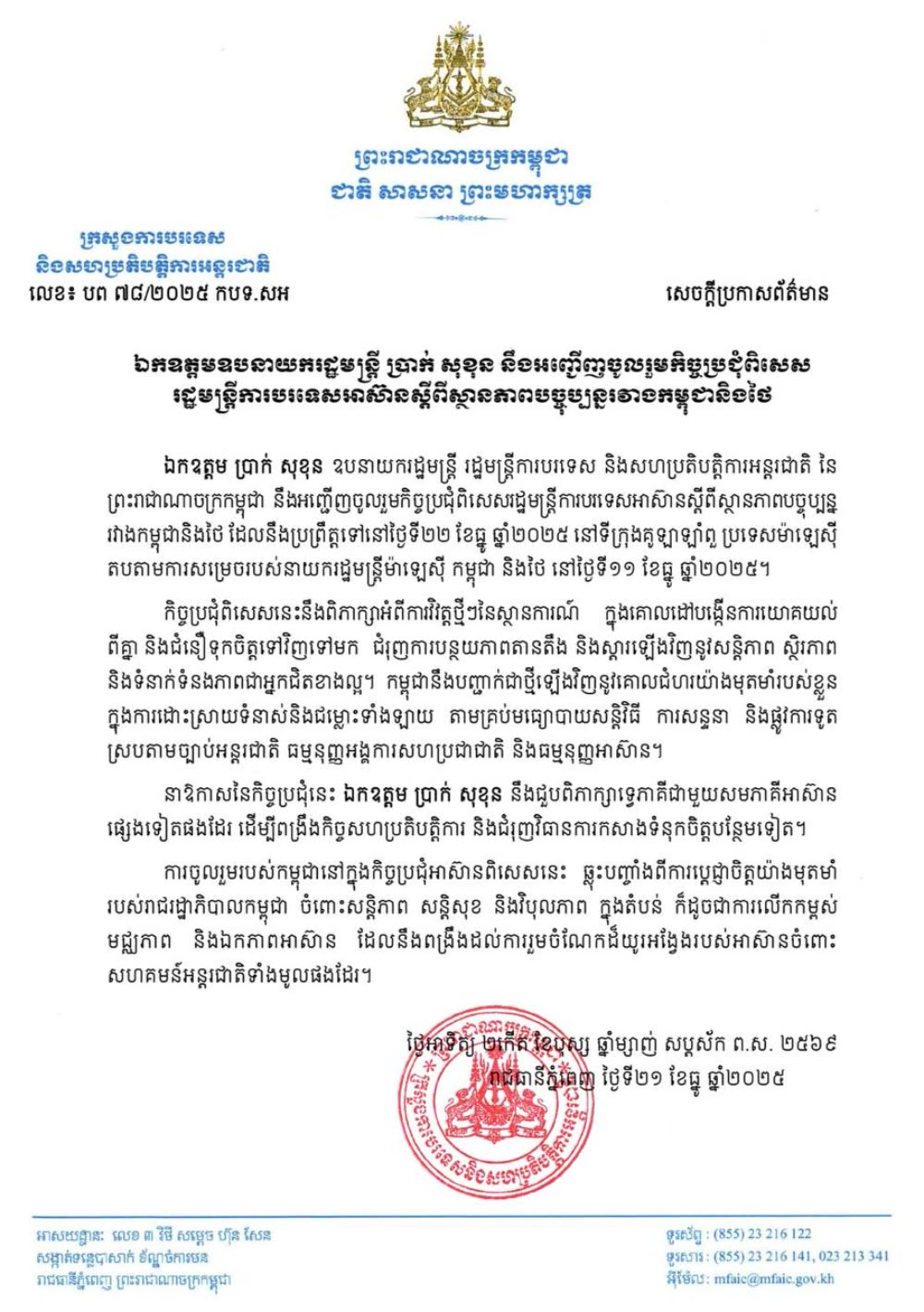 ឯកឧត្តម ប្រាក់ សុខុន ឧបនាយករដ្ឋមន្ត្រី រដ្ឋមន្ត្រីការបរទេស និងសហប្រតិបត្តិការអន្តរជាតិ នៃ ព្រះរាជាណាចក្រកម្ពុជា នឹងអញ្ជើញចូលរួមកិច្ចប្រជុំពិសេសរដ្ឋមន្ត្រីការបរទេសអាស៊ានស្តីពីស្ថានភាពបច្ចុប្បន្ន រវាងកម្ពុជានិងថៃ ដែលនឹងប្រព្រឹត្តទៅនៅថ្ងៃទី២២ ខែធ្នូ ឆ្នាំ២០២៥ នៅទីក្រុងគូឡាឡាំពួ ប្រទេសម៉ាឡេស៊ី តបតាមការសម្រេចរបស់នាយករដ្ឋមន្ត្រីម៉ាឡេស៊ី កម្ពុជា និងថៃ នៅថ្ងៃទី១១ ខែធ្នូ ឆ្នាំ២០២៥។