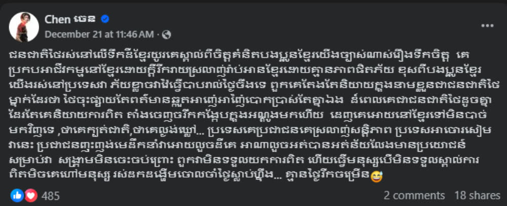 តារាចម្រៀងសម្លេងស្រទន់ លោក ចេន បានបង្ហោះសំណេរប្រៀបធៀបរវាងប្រជាជនខ្មែរ និងប្រជាជនថៃ ដែលរស់នៅធ្វើការចំណាក់ស្រុកមានភាពខុសគ្នា ខណៈប្រទេសកម្ពុជាជនជាតិថៃរស់នៅធ្វើការដោយក្តីរីករាយគ្មានភាពផិតភ័យ ខុសពីបងប្អូនខ្មែរយើងរស់នៅប្រទេសថៃ រងការភ័យខ្លាច គេវាយធ្វើបាបរាល់ថ្ងៃ បន្ថែមពីនេះតារាចម្រៀងប្រុសរូបនេះក៏បានលើកឡើងថាប្រជាជនថៃញុះញង់មេដឹកនាំឲ្យលួចដីគេ។