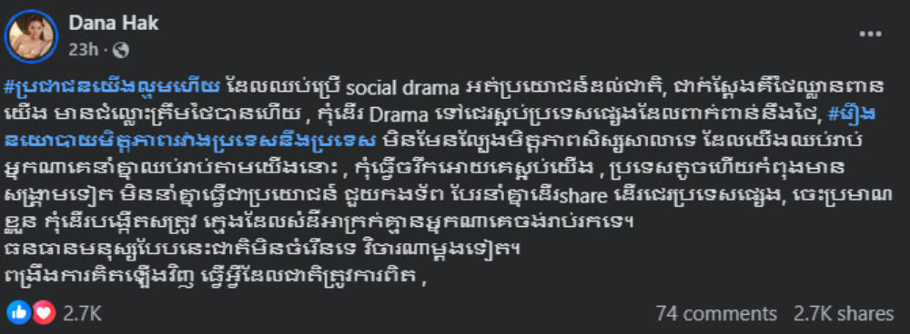 លោកជំទាវ ហាក់ ដាណា ភរិយារបស់ឯកឧត្តម ហ៊ុន គឹមជាតិ បានបង្ហោះសំណេរដាស់តឿនទៅកាន់អ្នកលេងបណ្ដាញសង្គមមួយចំនួន គួរតែបញ្ឈប់សកម្មភាពជេរស្អប់ប្រទេសផ្សេងដែលពាក់ព័ន្ធនឹងថៃ ព្រោះប្រទេសយើងកំពុងតែមានសង្រ្គាមត្រូវនាំគ្នាធ្វើជាប្រយោជន៍ជួយដល់កងទ័ព មិនគួរណាទៅជេរប្រទេសដទៃបង្កើតសត្រូវនោះឡើយ។
