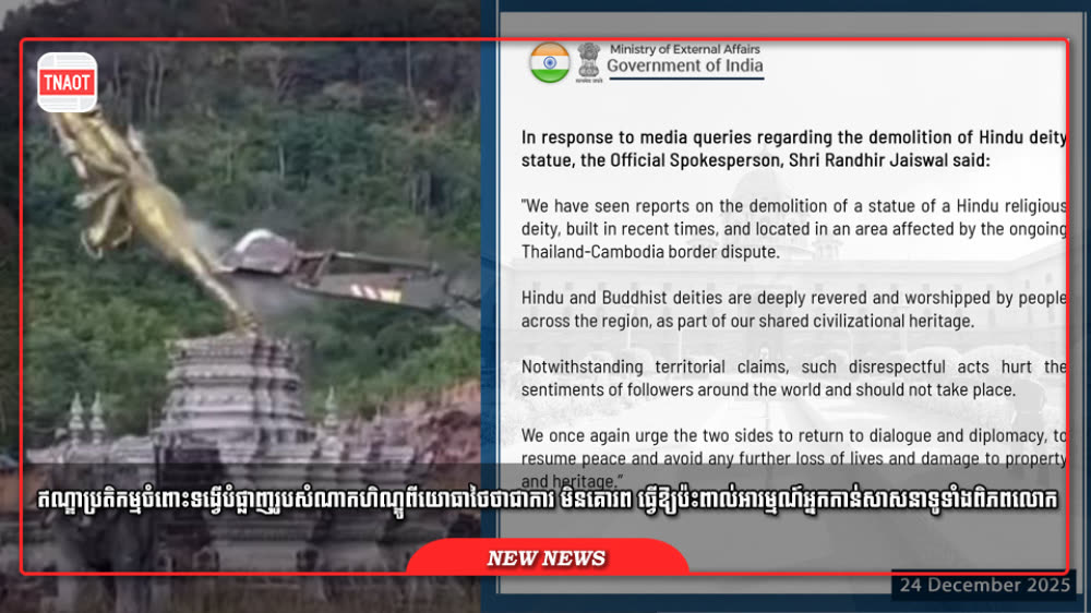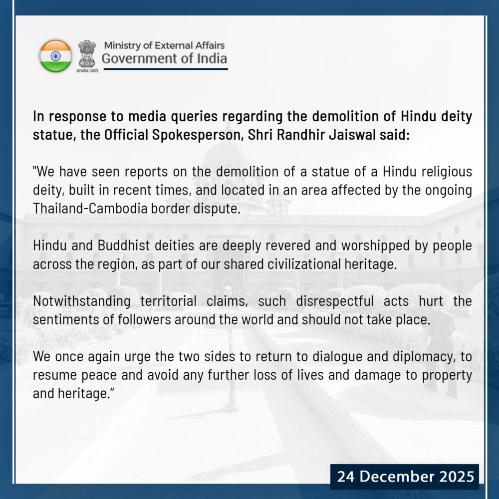 អ្នកនាំពាក្យផ្លូវការ លោក Shri Randhir Jaiswal បានមានលើកឡើងថា៖«យើងបានឃើញរបាយការណ៍អំពីការរុះរើរូបសំណាកអាទិទេពសាសនាហិណ្ឌូ ដែលមានទីតាំងនៅតំបន់ដែលរងផលប៉ះពាល់ដោយជម្លោះព្រំដែនថៃ-កម្ពុជា»។
