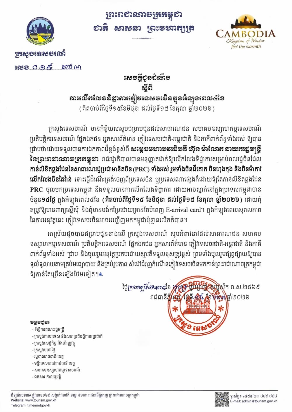 តាមសេចក្តីប្រកាសព័ត៌មានរបស់ក្រសួងទេសចរណ៍នៅថ្ងៃទី១៥ ខែមករា ឆ្នាំ២០២៦នេះ បានបញ្ជាក់ថាទោះការធ្វើដំណើរត្រង់ចេញពីប្រទេសចិន ឬប្រទេសណាផ្សេងក៏ដោយឱ្យតែកាន់លិខិតឆ្លងដែន PRC ចូលមកប្រទេសកម្ពុជា នឹងទទួលបានការលើកលែងទិដ្ឋាការ ដោយអាចស្នាក់នៅក្នុងប្រទេសកម្ពុជាបាន ចំនួន១៤ថ្ងៃ ក្នុងអំឡុងពេល៤ខែ គិតចាប់ពីថ្ងៃទី១៥ ខែមិថុនា ដល់ថ្ងៃទី១៥ ខែតុលា ឆ្នាំ២០២៦ដោយពុំ តម្រូវឱ្យមានពាក្យស្នើសុំ និងពុំមានបង់កម្រៃដោយគ្រាន់តែបំពេញ E-arrival card។