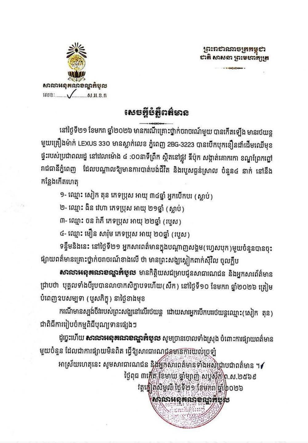 សាលាអនុគណខណ្ឌកំបូលបានចេញសេចក្តីបំភ្លឺពត៌មានចំពោះករណីគ្រោះថ្នាក់ចរាចរណ៍ បណ្ដាលឱ្យមនុស្សស្លាប់ និងមានស្បង់ចីវព្រះសង្ឃ នៅលើរថយន្ត កើតហេតុនៅថ្ងៃទី២១ ខែមករា ឆ្នាំ២០២៦ មានករណីគ្រោះថ្នាក់ចរាចរណ៍មួយ បានកើតឡើង មានរថយន្ត មួយគ្រឿងម៉ាក់ LEXUS 330 មានស្លាក់លេខ ភ្នំពេញ 2BG-3223 បានបើកបុកខឿនដាំដើមឈើមុខ ផ្ទះរបស់ប្រជាពលរដ្ឋ នៅវេលាម៉ោង ៤:០០នាទីព្រឹក ស្ថិតនៅផ្លូវ ឌីប៉ុក សង្កាត់គោករកា ខណ្ឌព្រែកព្នៅ រាជធានីភ្នំពេញ។