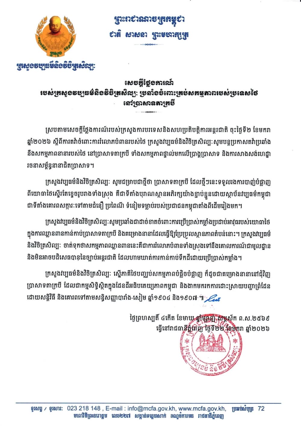 ស្របតាមសេចក្ដីថ្លែងការណ៍របស់ ក្រសួងការបរទេស និងសហប្រតិបត្តិការអន្តរជាតិ ចុះថ្ងៃទី២ ខែមករាឆ្នាំ២០២៦ ស្តីពីការតវ៉ាចំពោះការរំលោភបំពានរបស់ថៃ ក្រសួងវប្បធម៌ និងវិចិត្រសិល្បៈសូមបន្តប្រកាសតវ៉ាប្រឆាំង នឹងសកម្មភាពនានារបស់ថ នៅប្រាសាទតាក្របី ទាំងសកម្មភាពផ្ទាល់មកលើប្រាង្គប្រាសាទ និងការសាងសង់ហេដ្ឋ រចនាសម្ព័ន្ធនានាជិតប្រាសាទ។