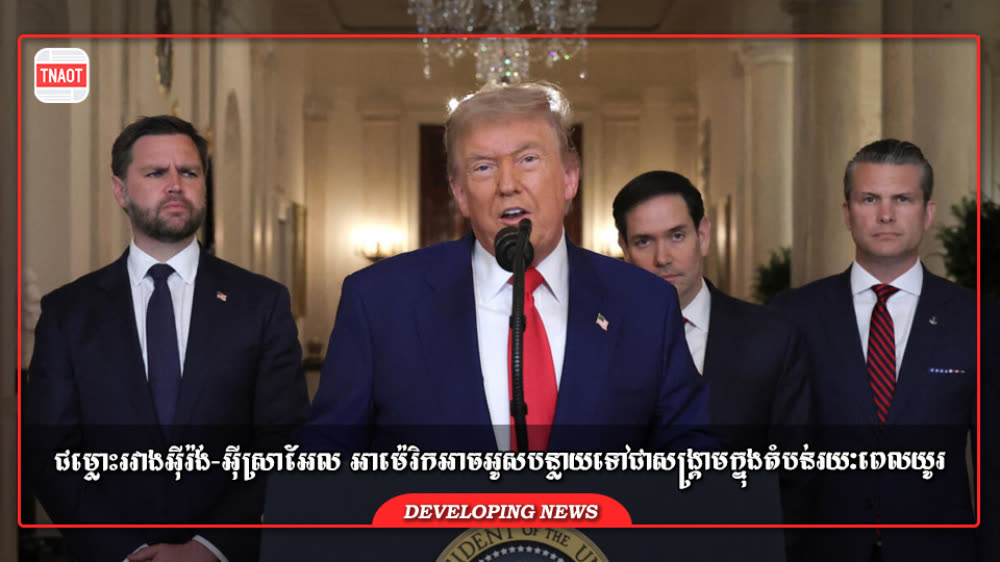 ថ្លែងពីសេតវិមានលោក Trump បានប្រកាសថា សង្គ្រាមប្រឆាំងនឹងអ៊ីរ៉ង់អាចមានរយៈពេលយូរ ដោយសង្កត់ធ្ងន់លើការបំផ្លាញកម្មវិធីមីស៊ីល កងទ័ពជើងទឹក និងនុយក្លេអ៊ែររបស់អ៊ីរ៉ង់ និងបញ្ឈប់ការគាំទ្ររបស់ខ្លួនចំពោះក្រុមប្រដាប់អាវុធនៅទូទាំងតំបន់ ដោយមិនរាប់បញ្ចូលការផ្តួលរំលំសាធារណរដ្ឋអ៊ីស្លាមនោះទេ៕