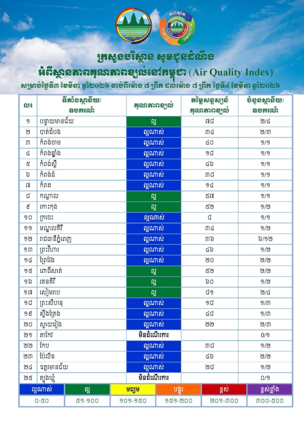 ក្រសួងបរិស្ថានបានតាមដានគុណភាពខ្យល់សាធារណៈជាប្រចាំ នៅរាជធានីភ្នំពេញ និងតាមបណ្តាខេត្តទូទាំងប្រទេសចំនួន ៥៩ទីតាំង និងបានបញ្ជូនរថយន្តត្រួតពិនិត្យគុណភាពខ្យល់ ចល័តទូទាំងប្រទេស។ បានបង្ហាញឱ្យឃើញថា គុណភាពខ្យល់នៅរាជធានីភ្នំពេញ និងតាមបណ្តាខេត្ត មានសភាពល្អប្រសើរ បើប្រៀបធៀបទៅនឹងស្តង់ដារគុណភាពខ្យល់សាធារណៈ ដោយកម្រិតភាគល្អិតនិចល់ PM 2.5 ជាមធ្យមក្នុងរយៈពេក២៤ម៉ោង ទាបជាងស្តង់ដាជាតិ គឺតូចជាង ៥០µg/m3។