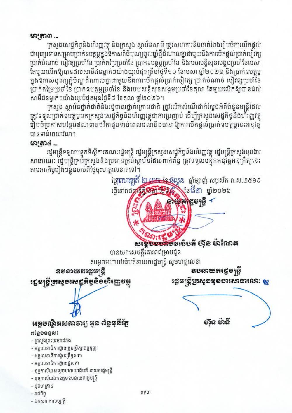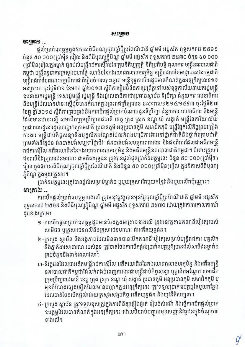 រាជរដ្ឋាភិបាល ផ្តល់ប្រាក់ឧបត្ថម្ភក្នុងឱកាសពិធីបុណ្យចូលឆ្នាំថ្មីប្រពៃណីជាតិ ចំនួន ៥០០០០(ប្រាំម៉ឺន)រៀល និងពិធីបុណ្យភ្ជុំបិណ្ឌចំនួន ៥០ ០០០ (ប្រាំម៉ឺន)រៀលក្នុងម្នាក់ ជូនដល់មន្ត្រីរាជការ និងកម្លាំងប្រដាប់អាវុធ។