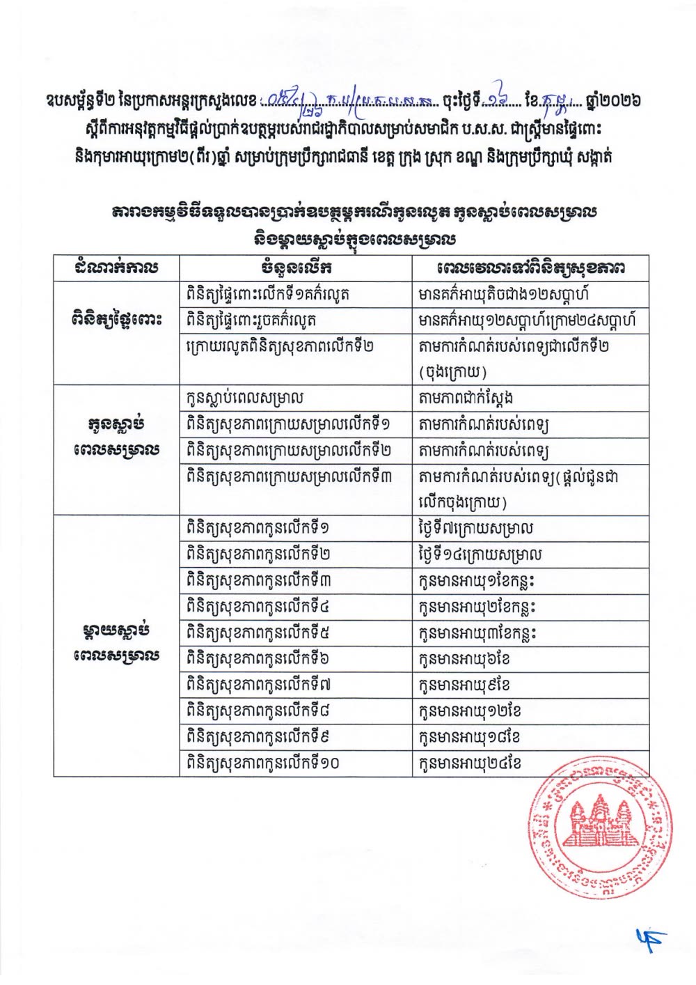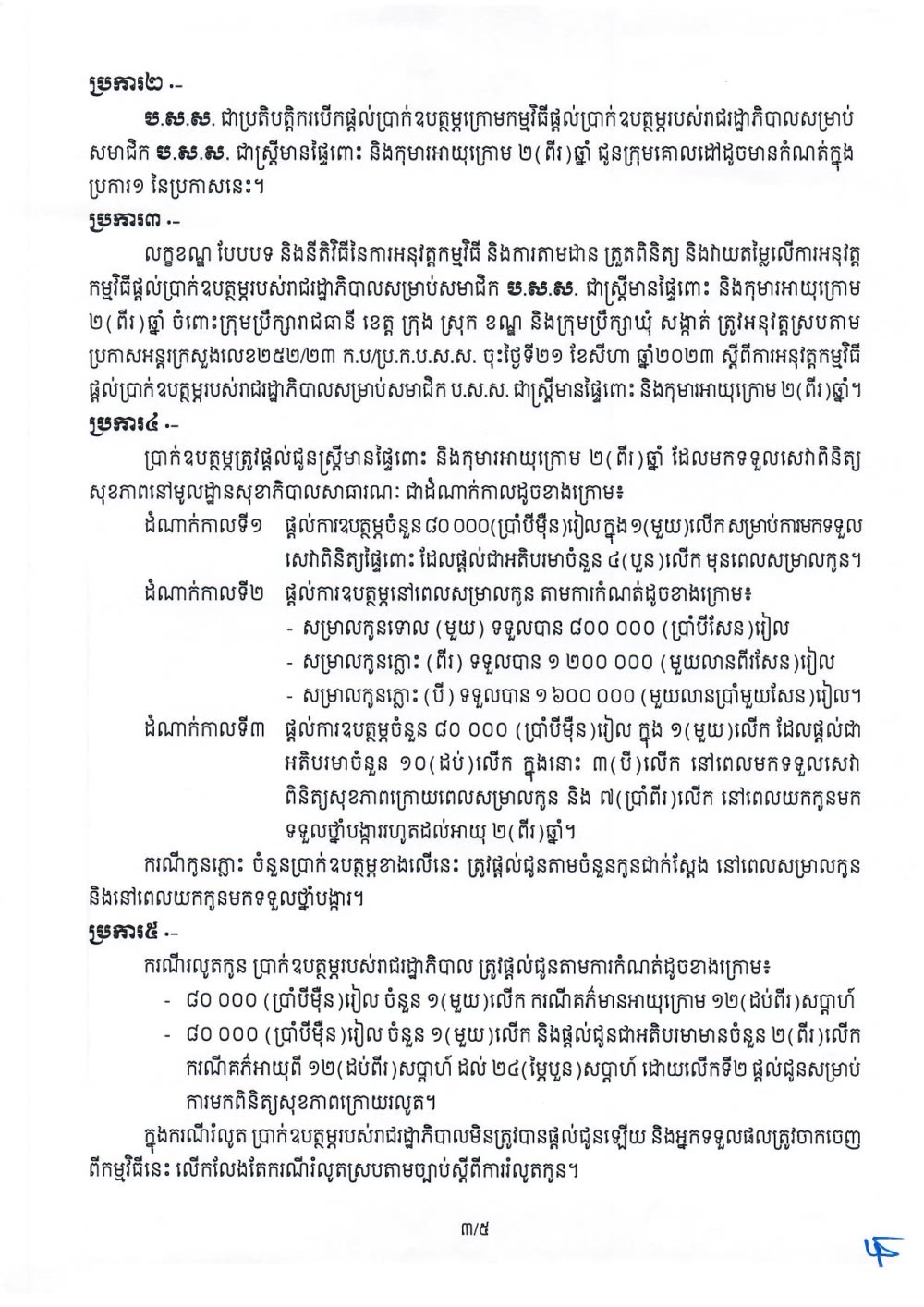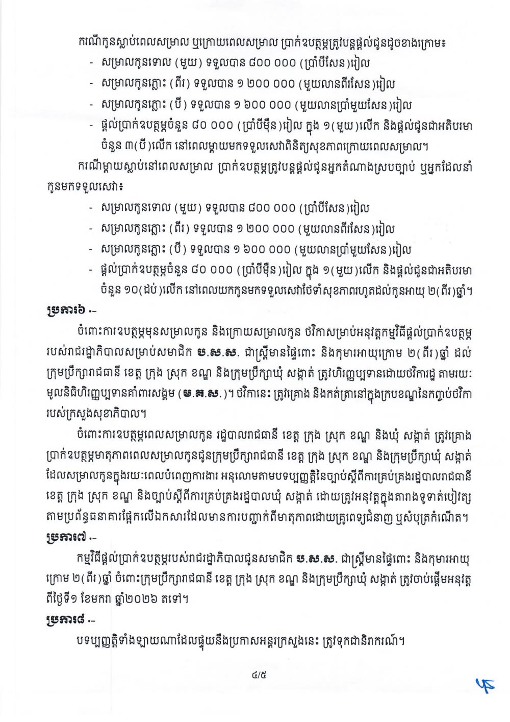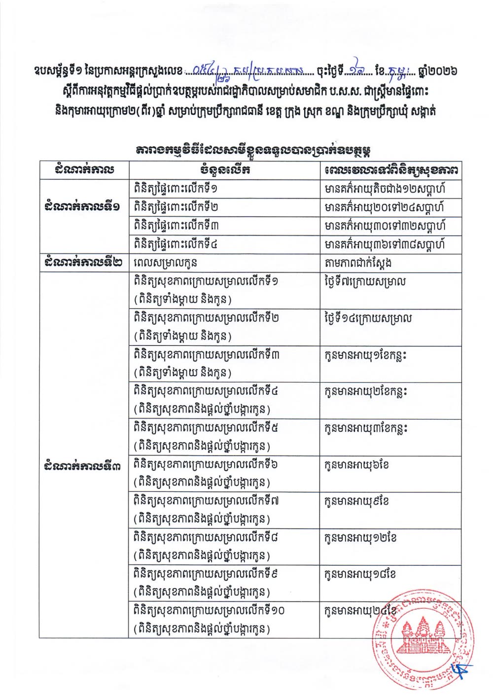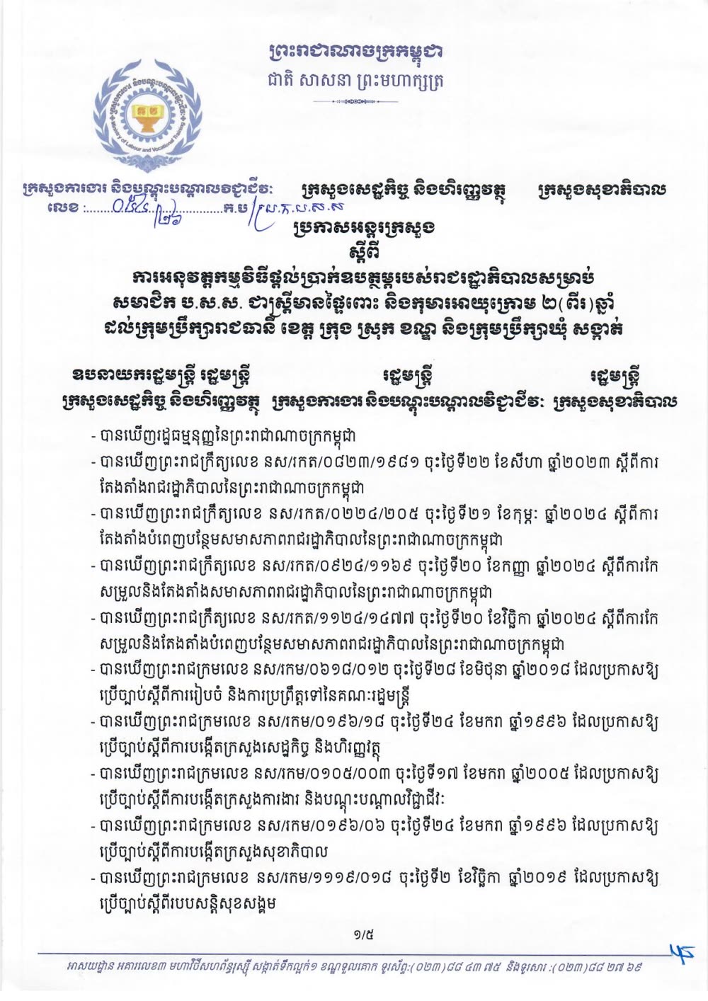 ប្រកាសអន្តរក្រសួងការអនុវត្តកម្មវិធីផ្តល់ប្រាក់ឧបត្ថម្ភរបស់រាជរដ្ឋាភិបាលសម្រាប់សមាជិក ប.ស.ស ជាស្រ្តីមានផ្ទៃពោះ និងកុមារអាយុក្រោម ២ (ពីរ)ឆ្នាំ