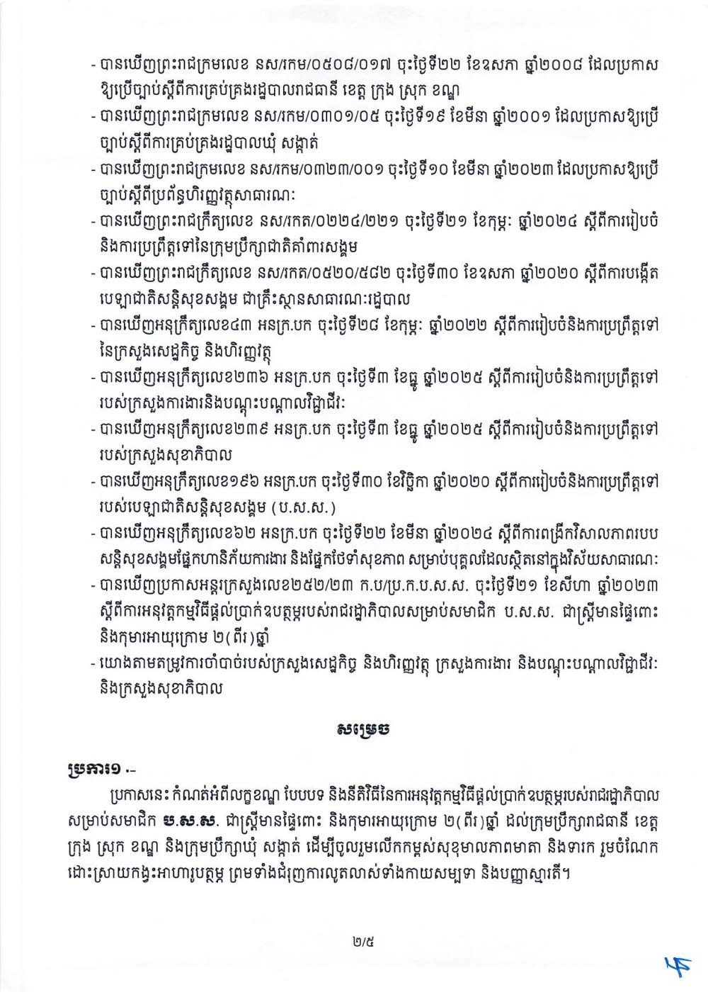 ប្រកាសអន្តរក្រសួង ស្តីពីការអនុវត្តកម្មវិធីផ្តល់ប្រាក់ឧបត្ថម្ភរបស់រាជរដ្ឋាភិបាលសម្រាប់សមាជិក ប.ស.ស ជាស្រ្តីមានផ្ទៃពោះ និងកុមារអាយុក្រោម ២ (ពីរ)ឆ្នាំ ដល់ក្រុមប្រឹក្សារាជធានី ខេត្ត ក្រុង ស្រុក ខណ្ឌ និងក្រុមប្រឹក្សាឃុំ សង្កាត់។