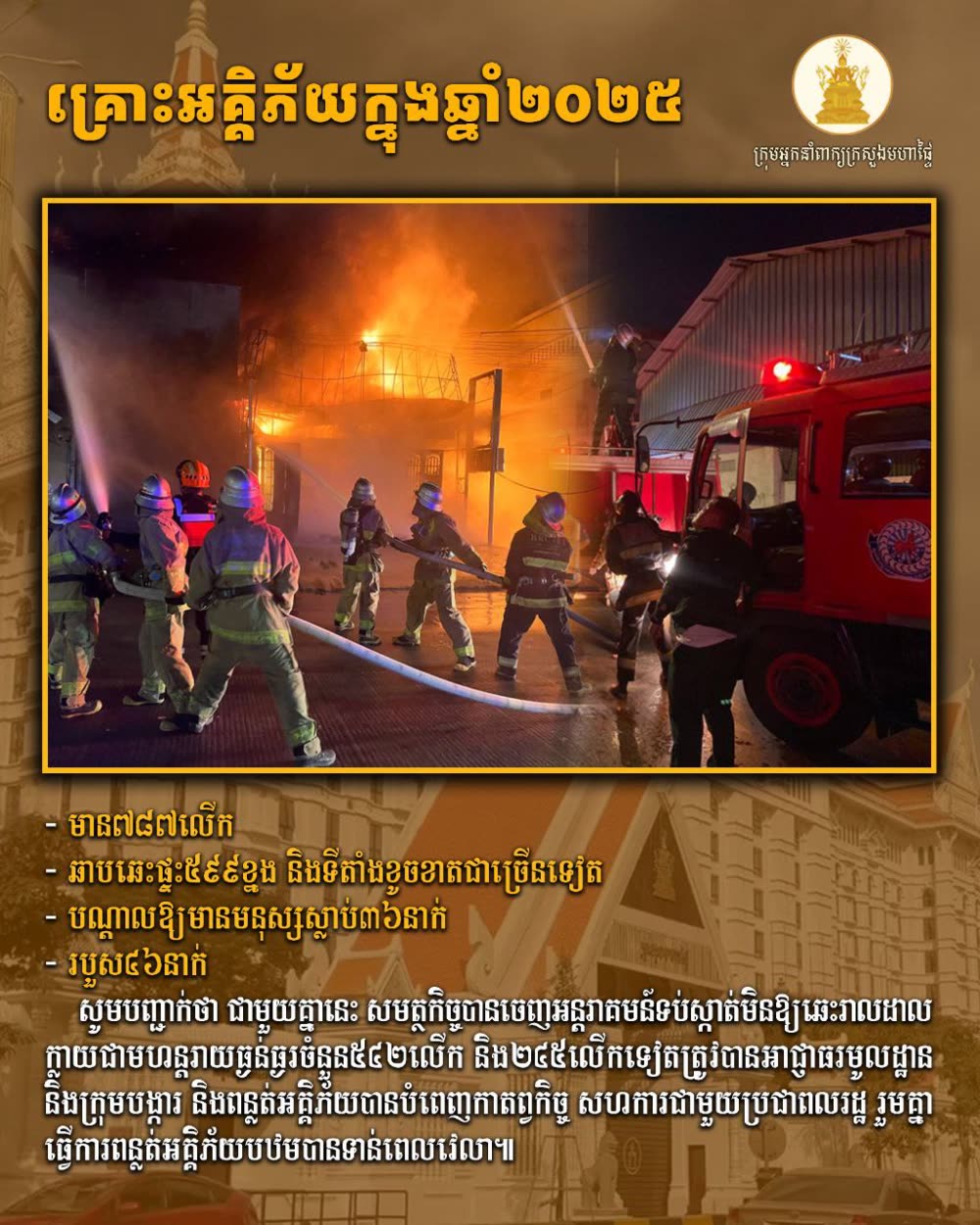 ករណីអគ្គិភ័យក្នុងឆ្នាំ២០២៥ មាន៧៨៧លើកឆាបឆេះផ្ទះ៥៩៩ខ្នង និងជាច្រើនទៀត