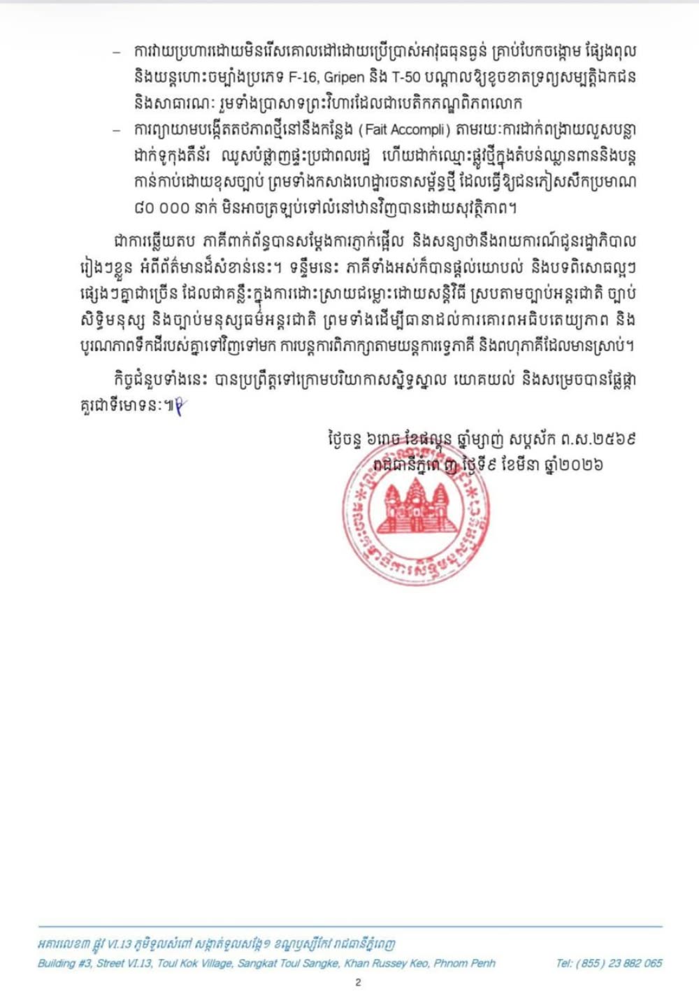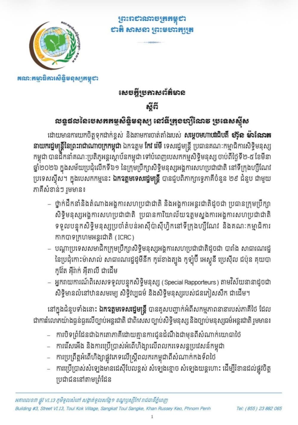 ក្នុងជំនួបទ្វេភាគីចំនួន ២៩ ក្នុងសម័យប្រជុំលើកទី៦១ នៃក្រុមប្រឹក្សា សិទ្ធិមនុស្សអង្គការសហប្រជាជាតិ ប្រធានគណៈកម្មាធិការសិទ្ធិមនុស្សកម្ពុជា គូសបញ្ជាក់អំពីសកម្មភាពនានារបស់ភាគីថៃ រំលោភយ៉ាងធ្ងន់ធ្ងរលើច្បាប់អន្តរជាតិ ជាពិសេសច្បាប់សិទ្ធិមនុស្សនិងច្បាប់មនុស្សធម៌អន្តរជាតិ