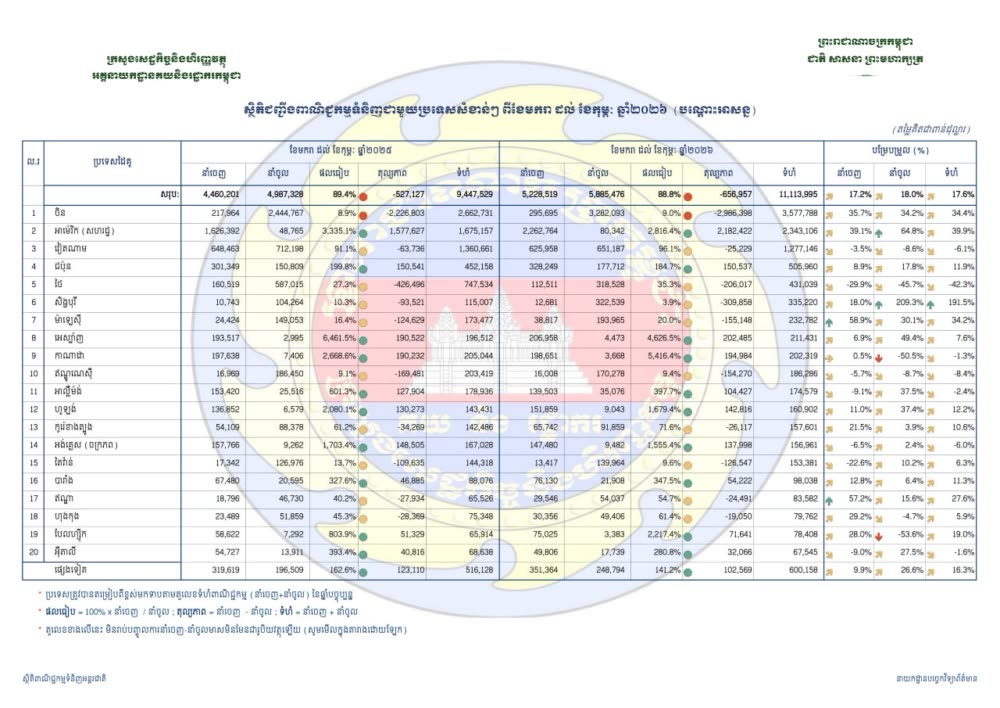 រយៈពេល ២ខែ នៃឆ្នាំ២០២៦ កម្ពុជាបាននាំចេញទំនិញចំនួន ៥២២៨ លានដុល្លារ និងនាំចូលទំនិញចំនួន ៥៨៨៥លានដុល្លារ។ ក្នុងនោះ កម្ពុជាបាននាំចេញទំនិញទៅថៃចំនួន ១១២ លានដុល្លារ និងនាំចូលទំនិញពីថៃចំនួន ៣១៨លានដុល្លារផងដែរ៕