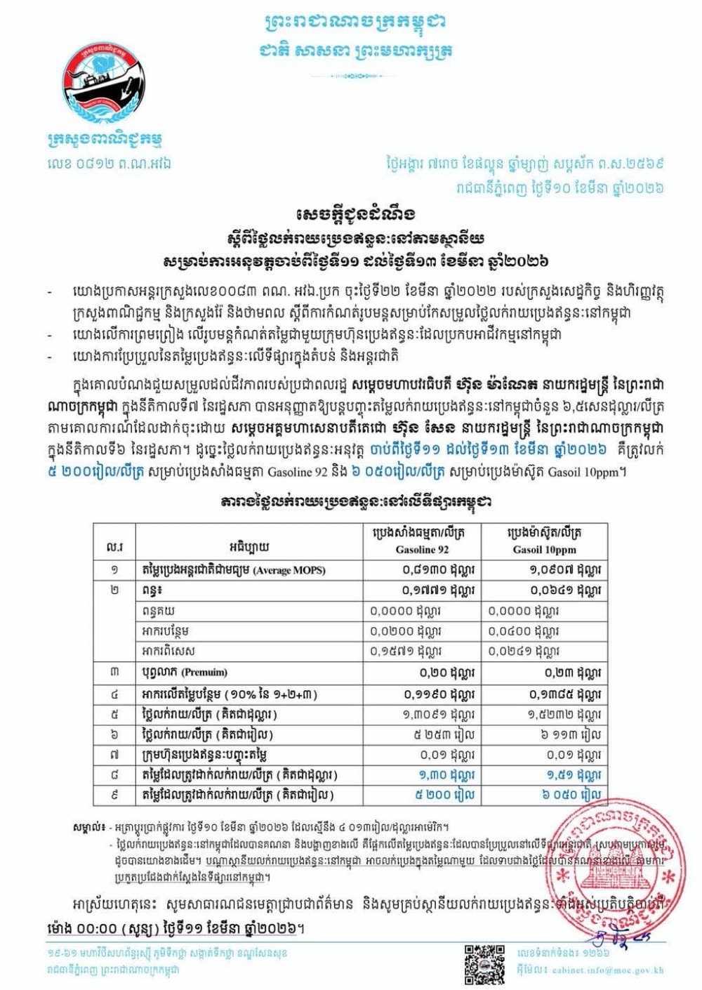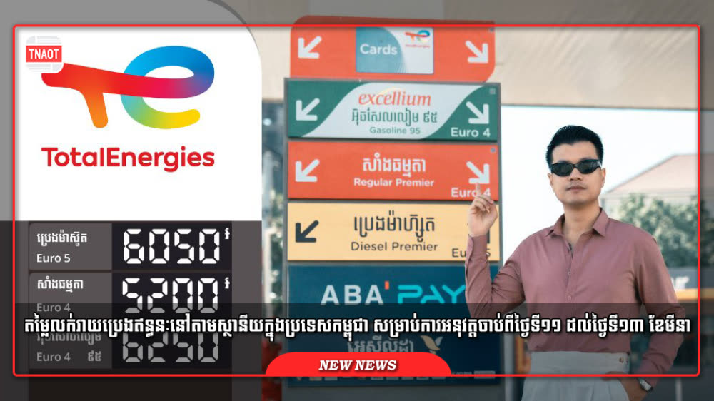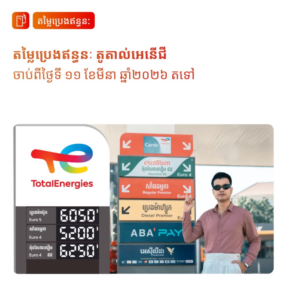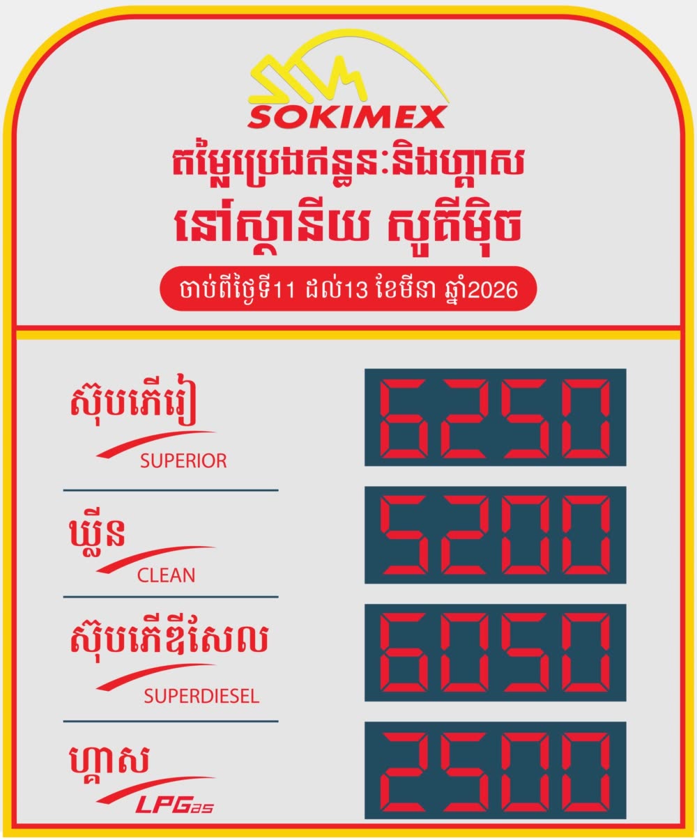 តម្លៃប្រេងកើនឡើង សម្រាប់ថ្ងៃទី១១ ដល់ទី១៣ ខែមីនា ឆ្នាំ២០២៦ តម្លៃលក់រាយប្រេងឥន្ធនៈដែលត្រូវអនុវត្តនៅកម្ពុជា ប្រេងសាំងធម្មតា ៥ ២០០ រៀល/លីត្រ ឡើង ៨០០រៀលនិងប្រេងម៉ាស៊ូត ៦ ០៥០ រៀល/លីត្រ ឡើង ៩០០រៀល។
