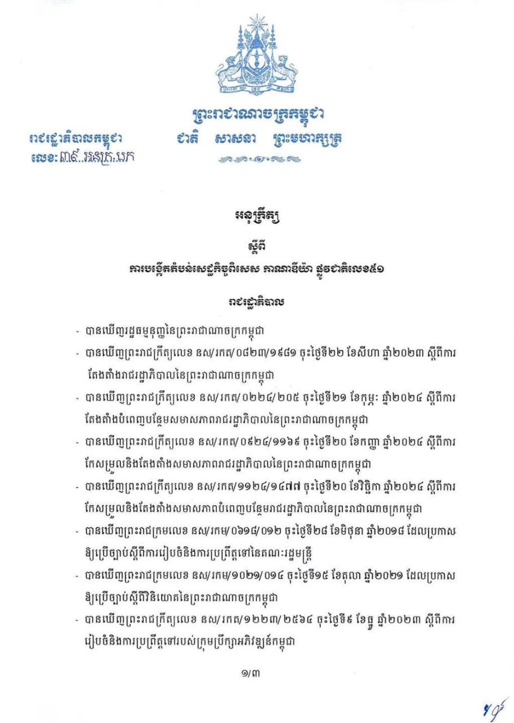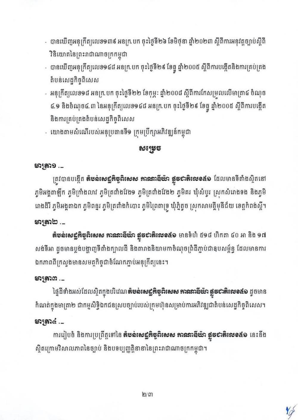 រាជរដ្ឋាភិបាល ចេញអនុក្រឹត្យ ស្តីពី ការបង្កើតតំបន់សេដ្ឋកិច្ចពិសេស កាណាឌីយ៉ា ផ្លូវជាតិលេខ៥១