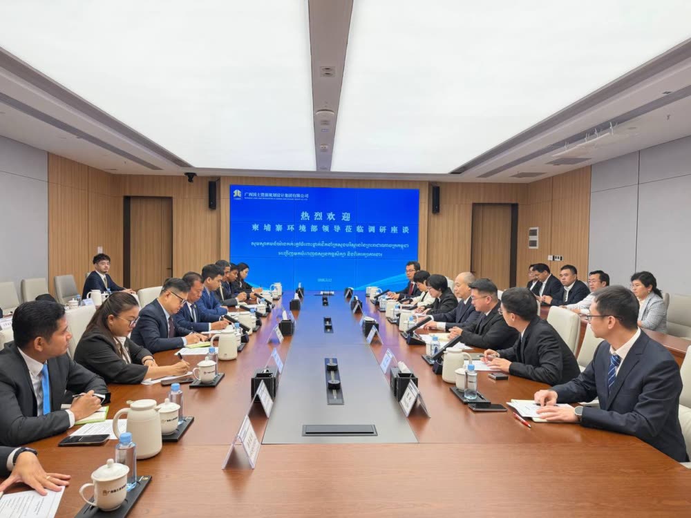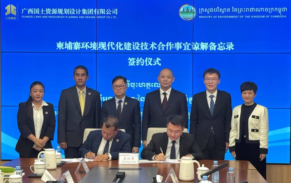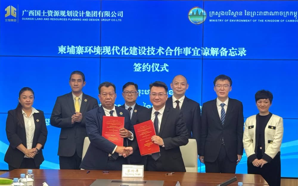 ក្រសួងបរិស្ថាននៃព្រះរាជាណាចក្រកម្ពុជា និងក្រុមហ៊ុនរដ្ឋ GUANGXI LAND AND RESOURCES PLANNING AND DESIGN GROUP CO., LTD នៃខេត្តហ្គ័ងស៊ី ចុះអនុស្សរណៈនៃការយោគយល់គ្នា ស្តីពី "កិច្ចសហប្រតិបត្តិការបច្ចេកទេសក្នុងការធ្វើទំនើបកម្មវិស័យបរិស្ថានកម្ពុជា"។