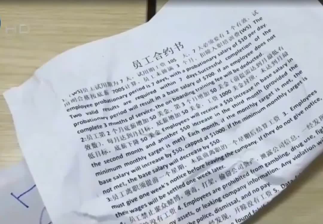 其中,在一份“员工合约”上,有记者发现:“新入职人员必须在7天试用期内完成至少两个“有效成果”,转正后每个月起薪为700美元,同时严禁泄露内部信息及删除任何聊天记录。”