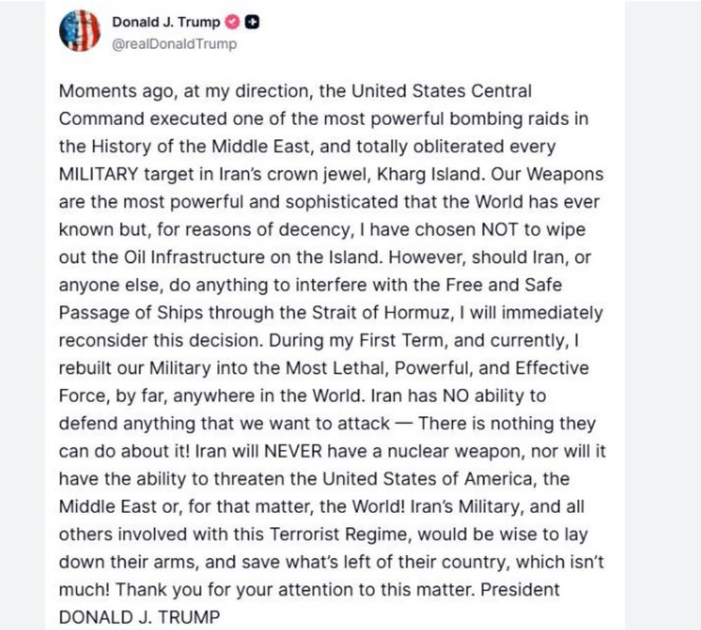 លោក Trump បាននិយាយថា លោកមានចេតនាទុកកន្លែងផលិតប្រេងរបស់អ៊ីរ៉ង់នៅលើកោះ Kharg ក្នុងអំឡុងពេលនៃការវាយប្រហារថ្មីៗនេះ ដោយផ្អាកការបំផ្លិចបំផ្លាញទាំងស្រុងមួយរយៈ។ ទោះជាយ៉ាងណាក៏ដោយ លោក Trump ព្រមានថា ប្រសិនបើអ៊ីរ៉ង់នៅតែបន្តបិទច្រកសមុទ្រ Hormuz ដែលជាផ្លូវប្រេងសកលដ៏សំខាន់មួយ លោកនឹងប្តូរទិសដៅ ហើយកំណត់គោលដៅទីតាំងប្រេងទាំងនោះភ្លាមៗ៕