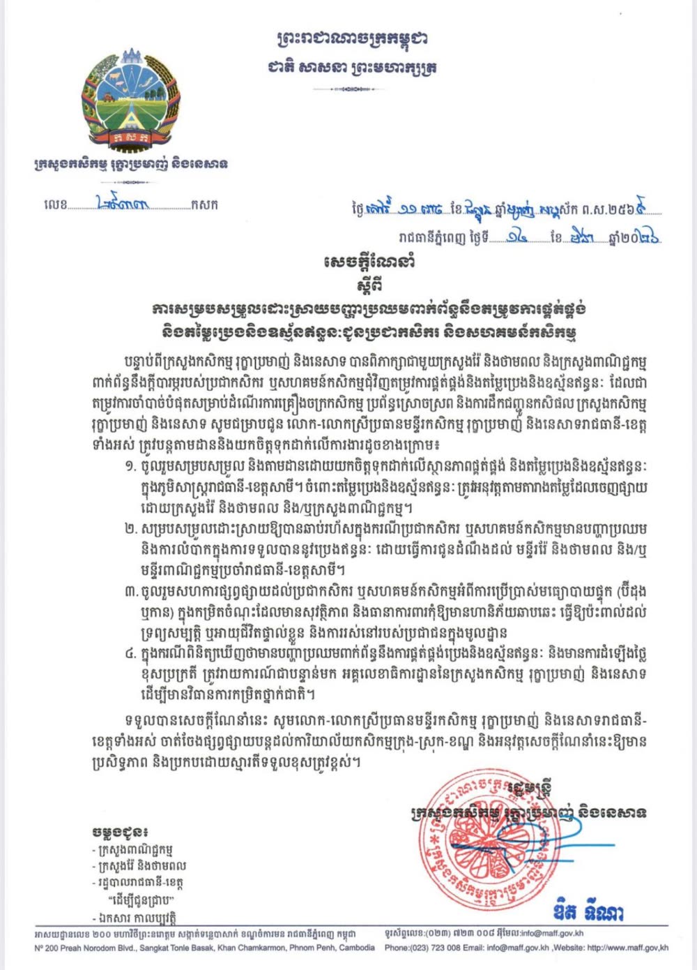 ទន្ទឹមនេះ ក្រសួងបានចេញសេចក្តីណែនាំដល់មន្ទីរកសិកម្មគ្រប់ខេត្តក្រុងទាំងអស់ ឱ្យតាមដានយកចិត្តទុកដាក់លើស្ថានភាពជាក់ស្តែងនៅក្នុងភូមិសាស្ត្ររបស់ខ្លួន និងសហការជាមួយមន្ទីររ៉ែនិងថាមពល ក៏ដូចជាមន្ទីរពាណិជ្ជកម្ម ដើម្បីផ្តល់ការអន្តរាគមន៍ភ្លាមៗ បើមានការឡើងថ្លៃខុសប្រក្រតី ឬក៏មានការខ្វះខាតការផ្គត់ផ្គង់។