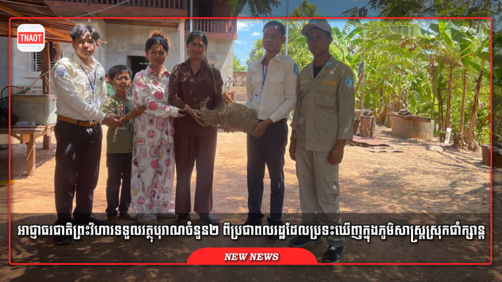 នៅថ្ងៃទី១៤ ខែមីនា ឆ្នាំ២០២៦ លោក ម៉ក់ ឌឿង អនុប្រធាននាយកដ្ឋានស្រាវជ្រាវ បណ្តុះបណ្តាល និងតម្កល់ឯកសារ ដឹកនាំមន្រ្តីចុះទៅទទួលវត្ថុបុរាណចំនួន២ ពីលោក សាន សែន មេបញ្ជាការរង មូលដ្ឋានកងរាជអាវុធហត្ថស្រុកជាំក្សាន្ត នៅផ្ទះរបស់គាត់ ស្ថិតនៅភូមិអូរក្សាន្ត ឃុំទឹកក្រហម ស្រុកជាំក្សាន្ត ខេត្តព្រះវិហារ។